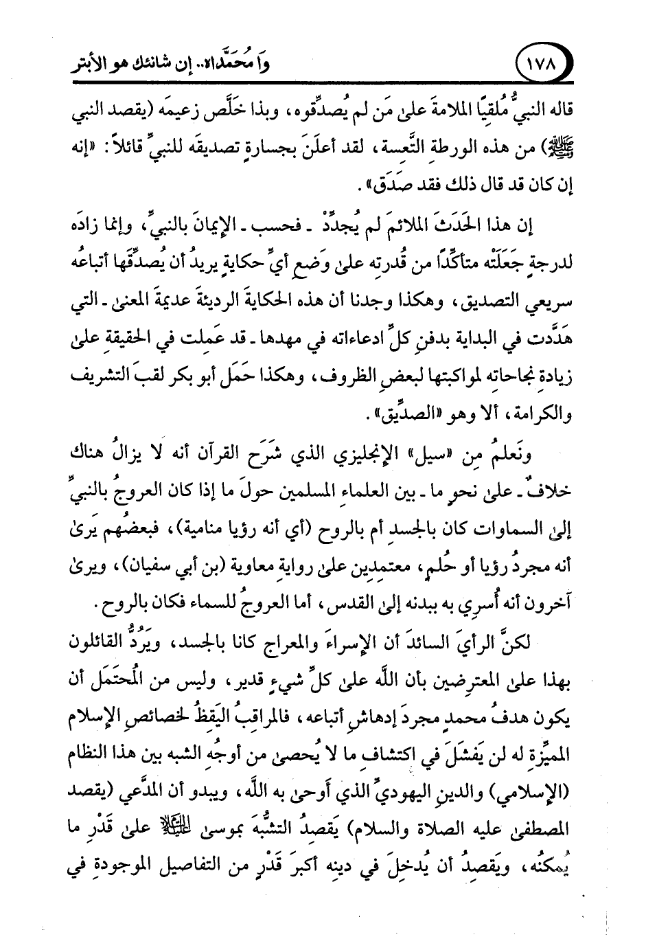 لكنَّ الرأيَ السائدَ أن الإسراءَ والمعراج كانا بالجسد، ويَرُدُّ القائلون بهذا على المعترِضين بأن الله على كلِّ شيءٍ قدير، وليس من المُحتَمَل أن يكون هدفُ محمدٍ مجردَ إدهاشِ أتباعه، فالمراقِبُ اليَقِظُ لخصائصِ الإسلام المميِّزةِ له لن يَفشَلَ في اكتشافِ ما لا يُحصى من أوجُهِ الشبه بين هذا النظام (الإسلامي) والدينِ اليهوديِّ الذي أَوحى به الله، ويبدو أن المدَّعي (يقصد المصطفى عليه الصلاة والسلام) يَقصِدُ التشُّبهَ بموسى - صلى الله عليه وسلم - على قَدْرِ ما يُمكنُه، وَيقصِدُ أن يُدخِلَ في دينِه أكبرَ قَدْرٍ من التفاصيل الموجودةِ في
