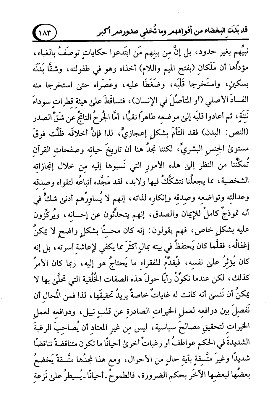 نبيِّهم بغير حدود، بل إنَّ مِن بينِهم مَن ابتَدعوا حكاياتٍ توصَفُ بالغباء، مؤدَّاها أن مَلَكانِ (بفتح الميم والسلام) أخذاه وهو في طفولته، وشقَّا بَدَنَه بسكينٍ، واستَخرجا قَلْبَه، وضَغَطَا عليه، وعَصَراه حتى استخرجا منه الفسادَ الأصلي (أو المتأصِّلَ في الإنسان)، فتساقَطَ على هيئةِ قِطراتٍ سوداءَ نَتِنَةٍ، ثم أعادوا قلبَه إلى موضعِه طاهرًا نقيًّا، أمَّا الجُرحُ الناتجُ عن شَقِّ الصدر (النص: البدن) فقد التَأَمَ بشكلٍ إعجازيٍّ، لذا فإنَّ أخلاقَه ظَلَّت فوقَ مستوى الجِنسِ البشريِّ، لكننا نجدُ هنا أن تاريخَ حياتِه وصفحاتِ القرآنِ تُمكنِّنُا من النظر إلى هذه الأمورِ التي نَسبوها إليه مِن خلال إنجازاتِه الشخصية، مما يجعلُنا نتشكَّكُ فيها ولابد، لقد مَجَّده أتباعُه لتقواه وصدقِه وعدالتِه وتواضعِه وصِدقِه وإنكارِه لذاته، إنهم لا يُساوِرُهم أدنى شكَّ في أنه نموذجٌ كاملٌ للإيمان والصدق، إنهم يتحدَّثون عن إحسانِه، ويُركِّزون عليه بشكلٍ خاص، فهم يقولون: إنه كان محسِنًا بشكلٍ واضحٍ لا يمكنُ إغفالُه، فقلَّما كان يَحتفظُ في بيته بمالٍ أكثَرَ مما يكفي لإعاشةِ أسرته، بل إنه كان يُؤثِرُ على نفسِه، فيُقدِّمُ للفقراءِ ما يَحتاجُ هو إليه، ربما كان الأمرُ كذلك، لكن عندما نكوِّنُ رأيًا حولَ هذه الصفات الخُلُقية التي تحلَّى بها لا يمكنُ أن نَنسى أنه كانت له غاياتٌ خاصةٌ يريدُ تحقيقَها، لذا فمن المُحالِ أن نَفصِلَ بين دوافعِه لعمل الخيراتِ الصادرةِ عن قلبٍ نبيل، ودوافعِه لعملِ الخيراتِ لتحقيقِ مصالحَ سياسية، ليس مِن غيرِ المعتادِ أن يُصاحِبَ الرغبةَ الشديدةَ في الحكم عواطفُ أو رغباتٌ أخرى أحيانًا ما تكون متناقضةً تناقضًا شديدًا وغيرَ متَّسِقةٍ بأيةِ حالٍ من الأحوال، ومع هذا نجدُها متَّسقةً يَخضعُ بعضُها لبعضِها الآخر بحكم الضرورة، فالطموحُ -أحيانًا- يُسيطرُ على نَزعةِ