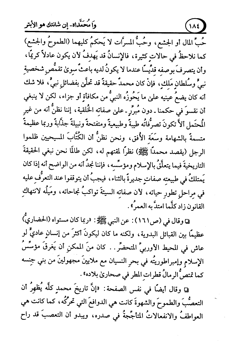 ° وقال في (ص 161): عن النبي - صلى الله عليه وسلم -: "ربما كان مستواه (الحضاريُّ) عظيمًا بين القبائل البدوية، ولكنه ما كان ليكونَ أكثرَ من إنسانٍ عاديٍّ لو عاش في المحيط الأوربيِّ المتحضِّر .. كان منَ الممكنِ أن يَغرقَ مؤسِّسُ الإسلام وإمبراطوريتُه في بحرِ النسيان مع ملايينَ مجهولينَ من بني جِنسه كما تمتصُّ الرمالُ قطراتِ المطر في صحارى بلاده".