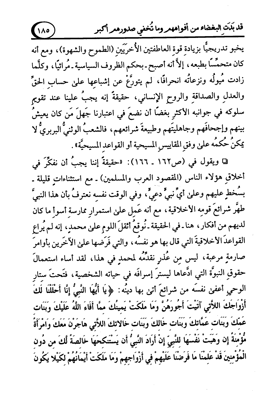 ° ويقول في (ص 162 - 166): "حقيقةً إننا يجبُ أن نفكِّرَ في أخلاقِ هؤلاء الناس (المقصود العرب والمسلمين) -مع استثناءاتٍ قليلة- بسُخطٍ عليهم وعلى أيِّ نبيٍّ دعِيٍّ، وفي الوقت نفسِه نعترفُ بأن هذا النبيَّ طهَّر شرائعَ قومِه الأخلاقية، مع أنه عَمِل على استمرارِ ممارسةِ أسوأِ ما كان لديهم من أفكار، هنا -في الحقيقة- نُوقعُ أثقلَ اللوم على محمدٍ، إنه لم يُراعِ القواعدَ الأخلاقيةَ التي قال بها هو نفسُه، والتي فَرَضها على الآخَرين بأوامرَ صارمةٍ مرعبة، ليس مِن عُذر نقدِّمه لمحمدٍ في هذا، لقد أساء استعمالَ حقوقِ النبوَّة التي ادَّعاها ليسترَ إسرافَه في حياته الشخصية، فتَحتَ سِتارِ الوحيِ أعفى نفسَه من شرائعَ أتى بها دينُه: {يَا أَيُّهَا النَّبِيُّ إِنَّا أَحْلَلْنَا لَكَ أَزْوَاجَكَ اللَّاتِي آتَيْتَ أُجُورَهُنَّ وَمَا مَلَكَتْ يَمِينُكَ مِمَّا أَفَاءَ اللَّهُ عَلَيْكَ وَبَنَاتِ عَمِّكَ وَبَنَاتِ عَمَّاتِكَ وَبَنَاتِ خَالِكَ وَبَنَاتِ خَالَاتِكَ اللَّاتِي هَاجَرْنَ مَعَكَ وَامْرَأَةً مُؤْمِنَةً إِنْ وَهَبَتْ نَفْسَهَا لِلنَّبِيِّ إِنْ أَرَادَ النَّبِيُّ أَنْ يَسْتَنْكِحَهَا خَالِصَةً لَكَ مِنْ دُونِ الْمُؤْمِنِينَ قَدْ عَلِمْنَا مَا فَرَضْنَا عَلَيْهِمْ فِي أَزْوَاجِهِمْ وَمَا مَلَكَتْ أَيْمَانُهُمْ لِكَيْلَا يَكُونَ