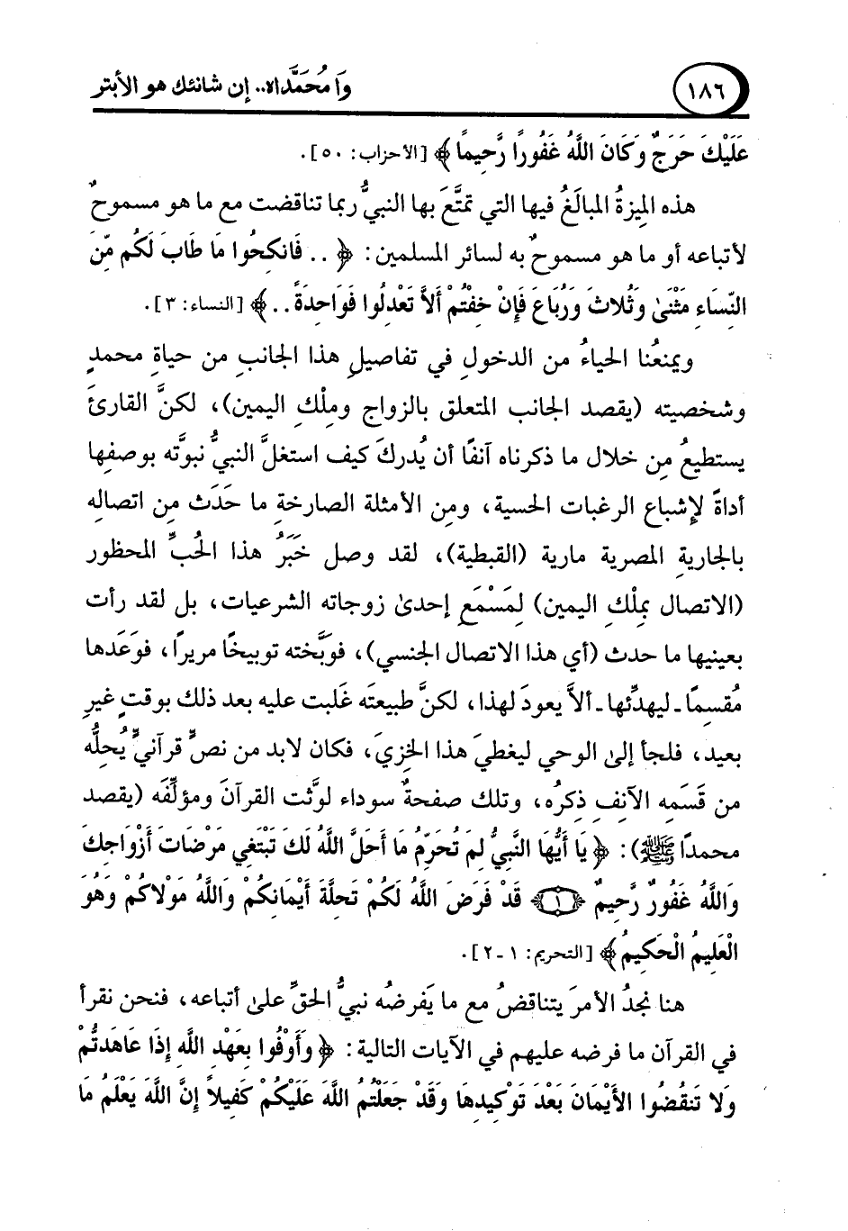 ويمنعُنا الحياءُ من الدخولِ في تفاصيلِ هذا الجانبِ من حياةِ محمدٍ وشخصيته (يقصد الجانب المتعلق بالزواج ومِلْكِ اليمين)، لكن القارئَ يستطيعُ مِن خلال ما ذكرناه آنفًا أن يُدركَ كيف استغلَّ النبي نبوَّته بوصفِها أداةً لإشباع الرغبات الحسية، ومِن الأمثلة الصارخةِ ما حَدَث مِن اتصالِه بالجاريةِ المصرية مارية (القبطية)، لقد وصل خَبَرُ هذا الحُبِّ المحظور (الاتصال بمِلْكِ اليمين) لِمَسْمَعِ إحدى زوجاته الشرعيات، بل لقد رأت بعينيها ما حدث (أي هذا الاتصال الجنسي)، فوَّبخته توبيخًا مريرًا، فوَعَدها مُقسِمًا -ليهدِّيها- ألاَّ يعودَ لهذا، لكن طبيعتَه غَلبت عليه بعد ذلك بوقتٍ غيرِ بعيد، فلجأ إلى الوحي ليغطيَ هذا الخِزيَ، فكان لا بد من نصٍّ قرآني يُحِلُّه من قَسَمِه الآنِفِ ذِكرُه، وتلك صفحة سوداء لوَّثت القرآنَ ومؤلِّفَه (يقصد محمدًا - صلى الله عليه وسلم -): {يَا أَيُّهَا النَّبِيُّ لِمَ تُحَرِّمُ مَا أَحَلَّ اللَّهُ لَكَ تَبْتَغِي مَرْضَاتَ أَزْوَاجِكَ وَاللَّهُ غَفُورٌ رَحِيمٌ (1) قَدْ فَرَضَ اللَّهُ لَكُمْ تَحِلَّةَ أَيْمَانِكُمْ وَاللَّهُ مَوْلَاكُمْ وَهُوَ الْعَلِيمُ الْحَكِيمُ (2)} [التحريم: 1 - 2].
