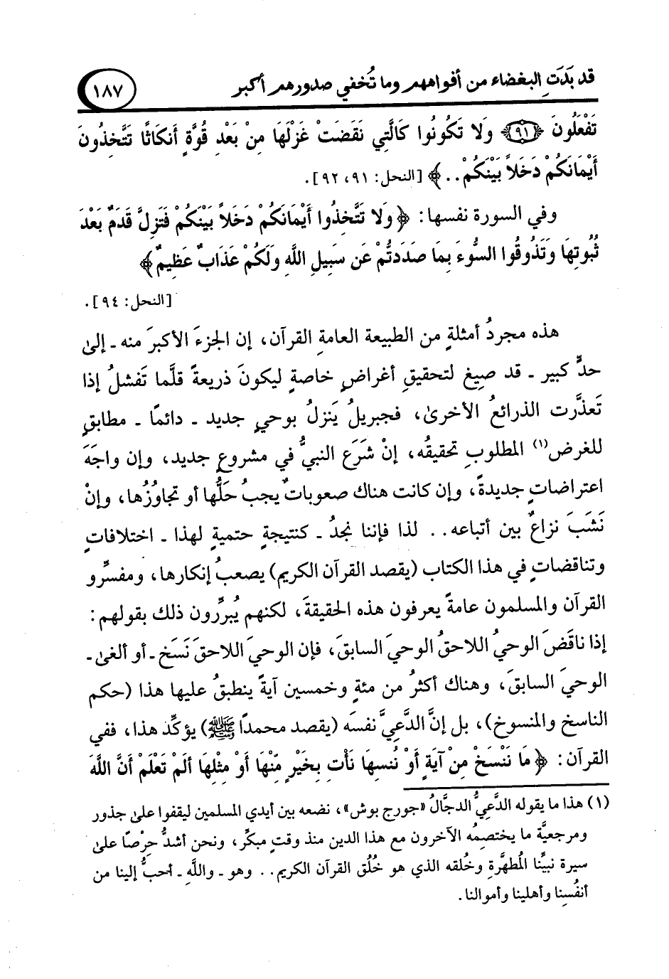 هذه مجردُ أمثلةٍ من الطبيعة العامةِ القرآن، إن الجزءَ الأكبرَ منه -إلى حدٍّ كبير- قد صِيغ لتحقيقِ أغراضٍ خاصةٍ ليكونَ ذريعةً قلَّما تَفشلُ إذا تَعذَّرَت الذرائعُ الأخرى، فجبريلُ يَنزلُ بوحيٍ جديد -دائمًا- مطابقٍ للغرض (¬1) المطلوبِ تحقيقُه، إنْ شَرعَ النبيُّ في مشروعٍ جديد، وإن واجَهَ اعتراضاتٍ جديدةً، وإن كانت هناك صعوباتٌ يجبُ حَلُّها أو تجاوُزُها، وإنْ نَشَبَ نزاعٌ بين أتباعه .. لذا فإننا نجدُ -كنتيجةٍ حتميةِ لهذا- اختلافاتٍ وتناقضاتٍ في هذا الكتاب (يقصد القرآن الكريم) يصعبُ إنكارها، ومفسِّرو القرآن والمسلمون عامةً يعرفون هذه الحقيقةَ، لكنهم يُبرِّرون ذلك بقولهم: إذا ناقَضَ الوحيُ اللاحقُ الوحيَ السابقَ، فإن الوحيَ اللاحقَ نَسَخ -أو ألغى- الوحيَ السابقَ، وهناك أكثرُ من مئةِ وخمسين آيةً ينطبقُ عليها هذا (حكم الناسخ والمنسوِخ)، بل إنَّ الدَّعِيَّ نفسَه (يقصد محمدًا - صلى الله عليه وسلم -) يؤكِّدُ هذا، ففي القرآن: {مَا نَنْسَخْ مِنْ آيَةٍ أَوْ نُنْسِهَا نَأْتِ بِخَيْرٍ مِنْهَا أَوْ مِثْلِهَا أَلَمْ تَعْلَمْ أَنَّ اللَّهَ