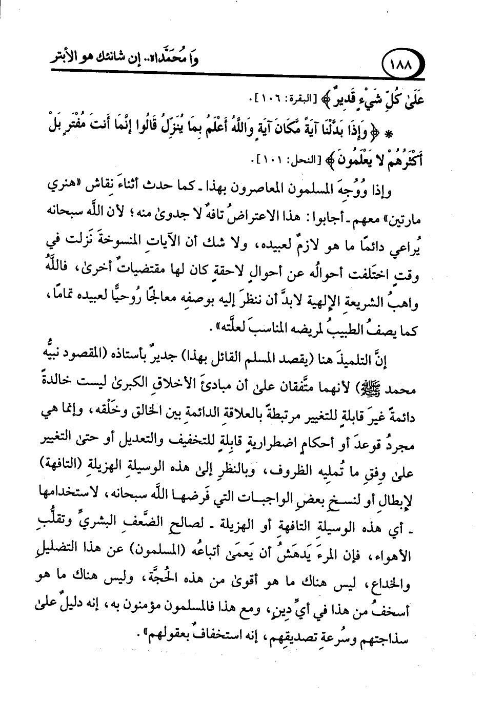 وإذا وُوجِهَ المسلمون المعاصرون بهذا -كما حدث أثناءَ نِقاش "هنري مارتين" معهم -أجابوا: هذا الاعتراضُ تافهٌ لا جدوى منه؛ لأن الله سبحانه يُراعي دائمًا ما هو لازمٌ لعبيده، ولا شك أن الآياتِ المنسوخةً نَزلت في وقتٍ اختَلفت أحوالُه عن أحوالِ لاحقةٍ كان لها مقتضياتٌ أخرى، فاللَّهُ واهبُ الشريعةٍ الإلهية لابدَّ أن ننظرَ إليه بوصفِه معالجًا رُوحيًّا لعبيده تمامًا، كما يصفُ الطبيبُ لمريضه المناسبَ لعلَّته".