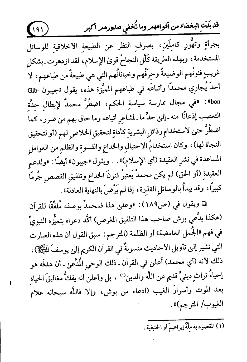 ° ويقول في (ص 189): "وعلى هذا فمحمدٌ بوصفه مُلفِّقًا للقرآن (هكذا يدَّعي بوش صاحب هذا التلفيق المغرض) أكَّد دعواه بتميُّزه النبويِّ في فهم "الجُمل الغامضة" أو الظلمة (المترجم: سبق القول أن هذه العبارت التي تشير إلى تأويل الأحاديث منسوبةٌ في القرآن الكريم إلى يوسفَ - صلى الله عليه وسلم -)، ذلك لأنه (أي محمد) أَعلن في القرآن -ذلك الوحيِ المُدَّعى- أن هدفَه هو إحياءُ تراثٍ دينيٍّ قديمٍ عن الله والدين (¬1)، بل وأعلن أنه يفكُّ مغاليقَ الحياةِ بعد الموت وأسرارَ الغيب (ادعاء من بوش، وإلا فالله سبحانه علام الغيوب/ المترجم) ".