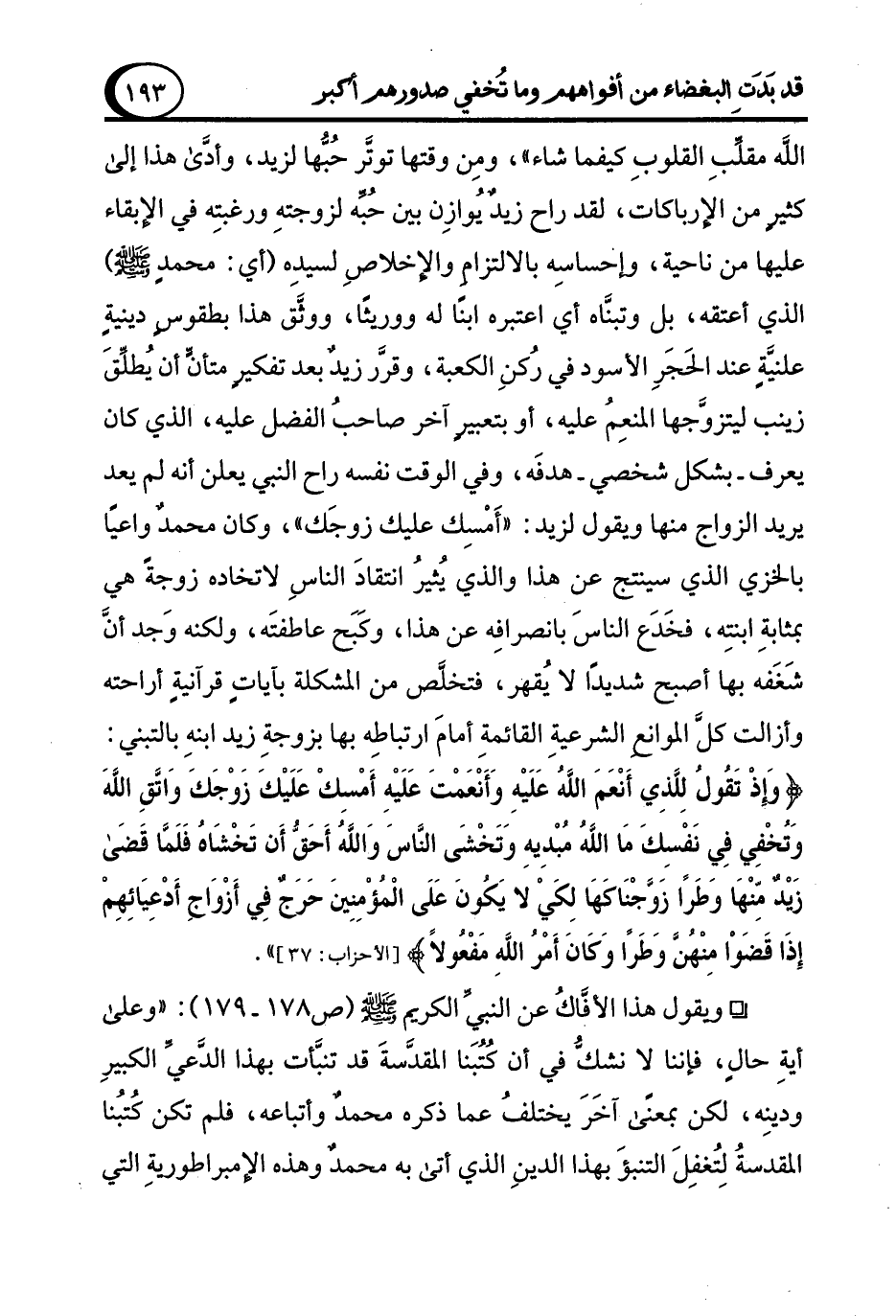 الله مقلِّبِ القلوبِ كيفما شاء"، ومِن وقتها توتَّر حُبُّها لزيد، وأدَّى هذا إلى كثير من الإرباكات، لقد راح زيدٌ يُوازِن بين حُبِّه لزوجتهِ ورغبتِه في الإبقاء عليها من ناحية، وإحساسِه بالالتزام والإخلاصِ لسيدِه (أي: محمدٍ - صلى الله عليه وسلم -) الذي أعتقه، بل وتبنَّاه أي اعتبره ابنًا له ووريثًا، ووثَّق هذا بطقوسٍ دينيةٍ علنيَّةٍ عند الحَجَرِ الأسود في رُكنِ الكعبة، وقرَّر زيدٌ بعد تفكيرٍ متأنٍّ أن يُطلِّقَ زينب ليتزوَّجها المنعِم عليه، أو بتعبيرٍ آخر صاحبُ الفضل عليه، الذي كان يعرف -بشكل شخصي- هدفَه، وفي الوقت نفسه راح النبي يعلن أنه لم يعد يريد الزواج منها ويقول لزيد: "أَمْسِك عليك زوجَك"، وكان محمدٌ واعيًا بالخزي الذي سينتج عن هذا والذي يُثيرُ انتقادَ الناسِ لاتخاده زوجةً هي بمثابةٍ ابنتِه، فخَدَع الناسَ بانصرافِه عن هذا، وكَبَح عاطفتَه، ولكنه وَجد أنَّ شَغَفه بها أصبح شديدًا لا يُقهر، فتخلَّص من المشكلة بآياتٍ قرآنيةٍ أراحته وأزالت كلَّ الموانع الشرعيةٍ القائمةٍ أمامَ ارتباطِه بها بزوجةٍ زيد ابنهِ بالتبني: {وَإِذْ تَقُولُ لِلَّذِي أَنْعَمَ اللَّهُ عَلَيْهِ وَأَنْعَمْتَ عَلَيْهِ أَمْسِكْ عَلَيْكَ زَوْجَكَ وَاتَّقِ اللَّهَ وَتُخْفِي فِي نَفْسِكَ مَا اللَّهُ مُبْدِيهِ وَتَخْشَى النَّاسَ وَاللَّهُ أَحَقُّ أَنْ تَخْشَاهُ فَلَمَّا قَضَى زَيْدٌ مِنْهَا وَطَرًا زَوَّجْنَاكَهَا لِكَيْ لَا يَكُونَ عَلَى الْمُؤْمِنِينَ حَرَجٌ فِي أَزْوَاجِ أَدْعِيَائِهِمْ إِذَا قَضَوْا مِنْهُنَّ وَطَرًا وَكَانَ أَمْرُ اللَّهِ مَفْعُولًا (37)} [الأحزاب: 37].