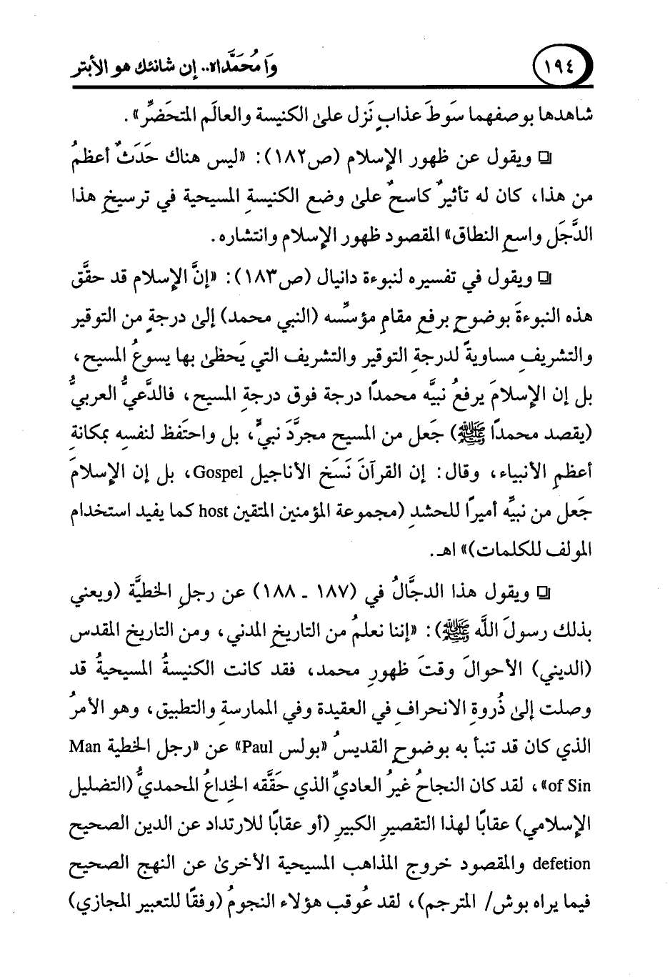 ° ويقول عن ظهور الإسلام (ص 182): "ليس هناك حَدَثٌ أعظمُ من هذا، كان له تأثيرٌ كاسحٌ على وضع الكنيسةٍ المسيحي في ترسيخ هذا الدَّجَل واسع النطاق" المقصود ظهور الإسلام وانتشاره.