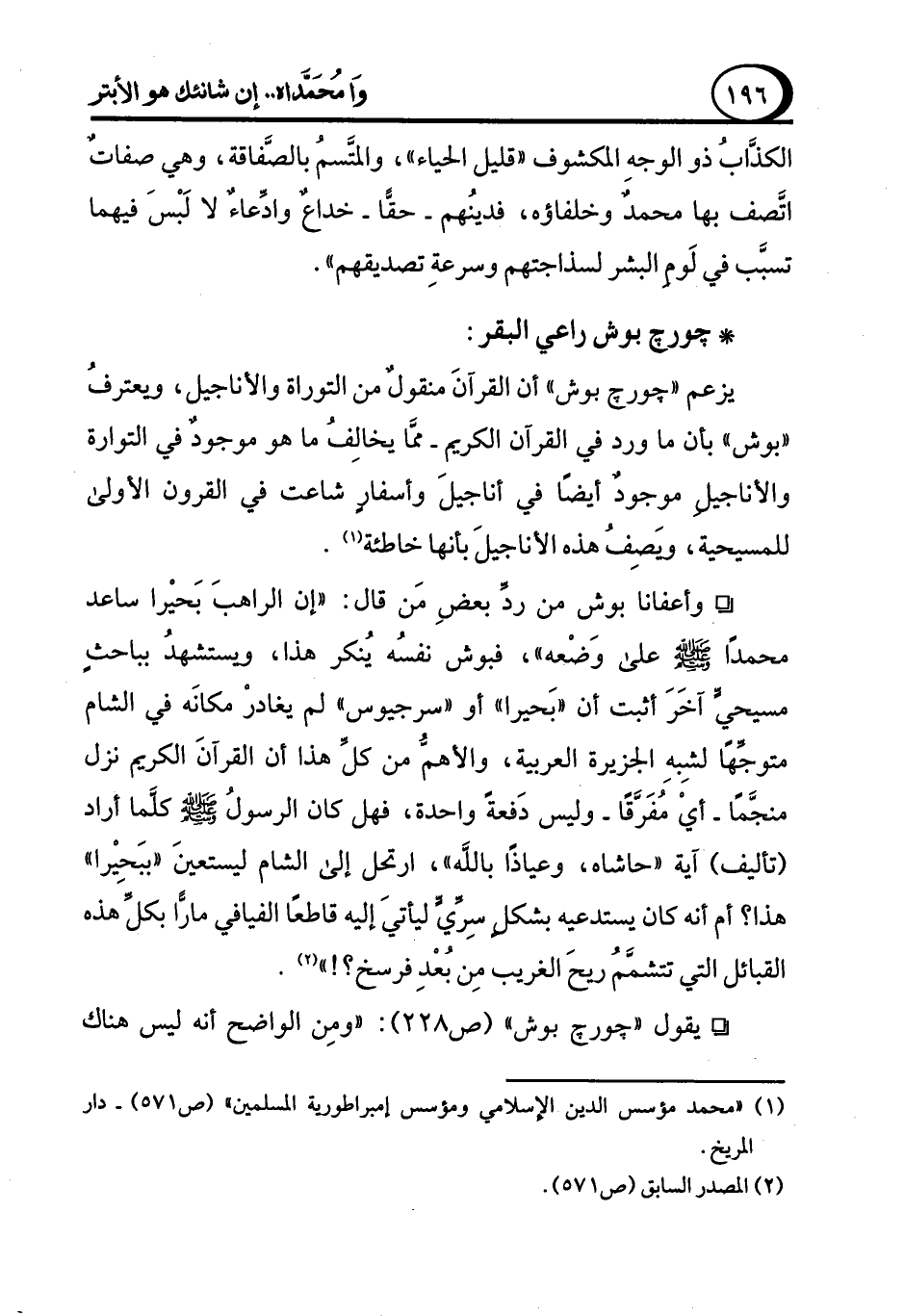 ° وأعفانا بوش من ردِّ بعضِ مَن قال: "إن الراهبَ بَحيْرا ساعد محمدًا - صلى الله عليه وسلم - على وَضْعه"، فبوش نفسُه يُنكر هذا، ويستشهدُ بباحثٍ مسيحيٍّ آخَرَ أثبت أن "بَحيرا" أو "سرجيوس" لم يغادرْ مكانَه في الشام متوجِّهًا لشِبهِ الجزيرة العربية، والأهمُّ من كلِّ هذا أن القرآنَ الكريم نزل منجَّمًا -أيْ مُفَرَّقًا- وليس دَفعةً واحدة، فهل كان الرسولُ - صلى الله عليه وسلم - كلما أراد (تأليف) آية "حاشاه، وعياذًا بالله"، ارتحل إلى الشام ليستعينَ "ببَحيْرا" هذا؟ أم أنه كان يستدعيه بشكل سِرِّيٍّ ليأتيَ إليه قاطعًا الفيافي مارًّا بكلِّ هَذه القبائل التي تتشمَّمُ ريحَ الغريب مِن بُعْدِ فرسخ؟! " (¬2).