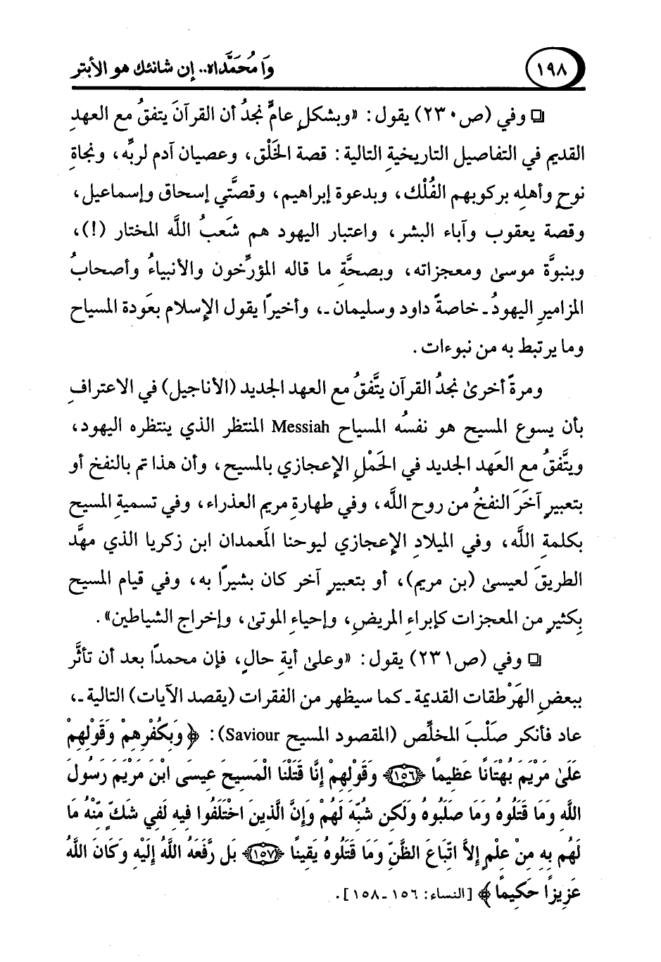 ° وفي (ص 230) يقول: "وبشكل عامٍّ نجدُ أن القرآنَ يتفقُ مع العهدِ القديم في التفاصيل التاريخيةٍ التالية: قصة الخَلْق، وعصيان آدم لربِّه، ونجاةِ نوح وأهلِه بركوبهم الفُلْك، وبدعوة إبراهيم، وقصَّتي إسحاق وإسماعيل، وقصة يعقوب وآباء البشر، واعتبار اليهود هم شَعبُ الله المختار (!)، وبنبوَّة موسى ومعجزاته، وبصحَّةِ ما قاله المؤرِّخون والأنبياءُ وأصحابُ المزاميرِ اليهودُ -خاصةً داود وسليمان-، وأخيرًا يقول الإسلام بعَودة المسياح وما يرتبط به من نبوءات.