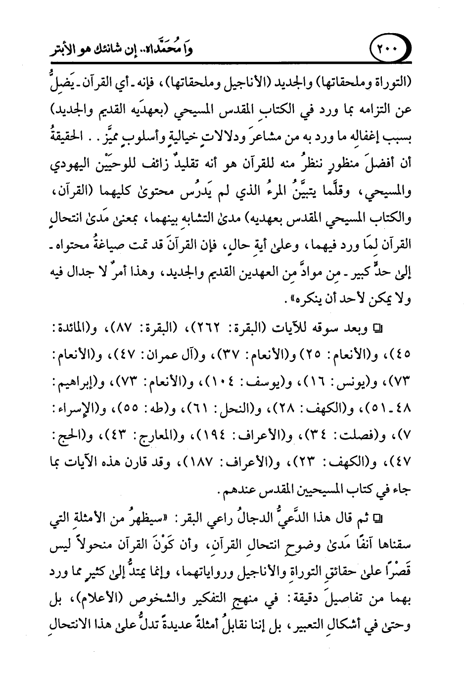 ° ثم قال هذا الدَّعيُّ الدجالُ راعي البقر: "سيظهرُ من الأمثلةِ التي سقناها آنفًا مَدى وضوحِ انتحالِ القرآنِ، وأن كَوْنَ القرآن منحولاً ليس قَصْرًا على حقائقِ التوراةِ والأناجيل ورواياتهما، وإنما يمتدُّ إلى كثيرٍ مما ورد بهما من تفاصيلَ دقيقة: في منهجِ التفكير والشخوص (الأعلام)، بل وحتى في أشكالِ التعبير، بل إننا نقابلُ أمثلةً عديدةً تدلُّ على هذا الانتحالِ