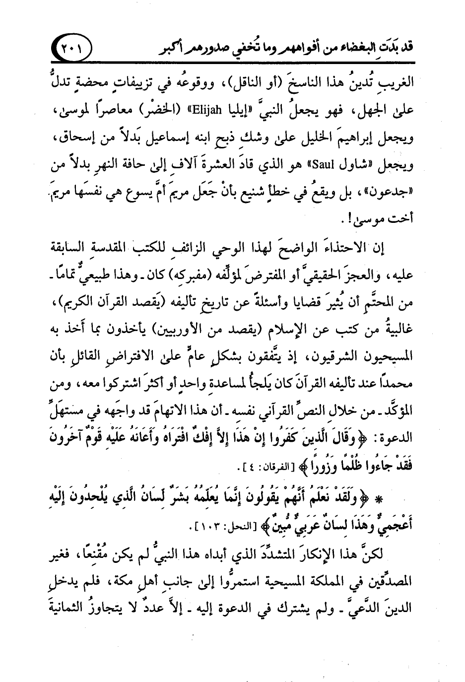 * {وَلَقَدْ نَعْلَمُ أَنَّهُمْ يَقُولُونَ إِنَّمَا يُعَلِّمُهُ بَشَرٌ لِسَانُ الَّذِي يُلْحِدُونَ إِلَيْهِ أَعْجَمِيٌّ وَهَذَا لِسَانٌ عَرَبِيٌّ مُبِينٌ} [النحل: 103].