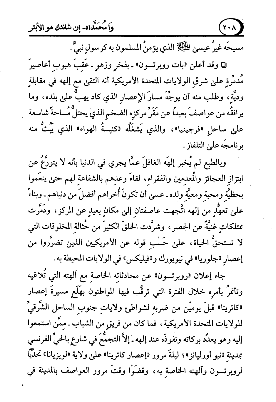 ° وقد أعلن "بات روبرتسون" -بفخرٍ وزهوٍ- عَقِبَ هبوبِ أعاصيرَ مُدمِّرةٍ على شرقِ الولايات المتحدة الأمريكية أنه التقى مع إلهه في مقابلةٍ وديَّةٍ، وطلب منه أن يوجِّهَ مسارَ الإعصارِ الذي كاد يهبُّ على بلده، وما يرافقُه من عواصفَ بعيدًا عن مَقَرِّ مركزِه الضخمِ الذي يحتلُّ مساحةً شاسعة على ساحلِ "فرجينيا"، والذي يَشغَلُه "كنيسةُ الهواء" الذي يَبُثُّ منه برنامجَه على التلفاز.