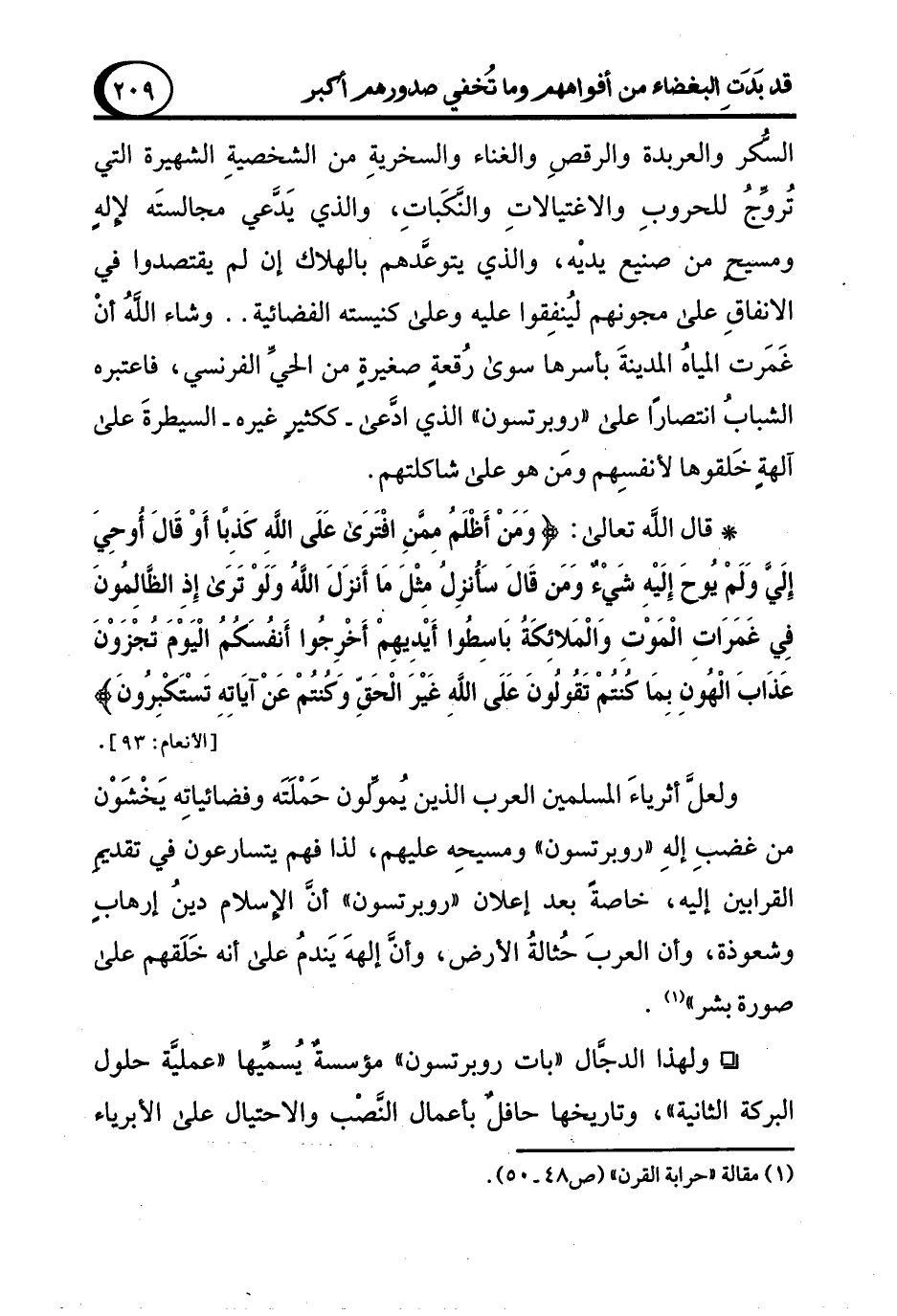 ولعلَّ أثرياءَ المسلمين العرب الذين يُموِّلون حَمْلَتَه وفضائياتِه يَخْشَوْن من غضبِ إلهِ "روبرتسون" ومسيحِه عليهم، لذا فهم يتسارعون في تقديمٍ القرابين إليه، خاصةً بعد إعلان "روبرتسون" أنَّ الإسلام دينُ إرهابٍ وشعوذة، وأن العربَ حُثالةُ الأرض، وأنَّ إلههَ يَندمُ على أنه خَلَقهم على صورة بشر" (¬1).