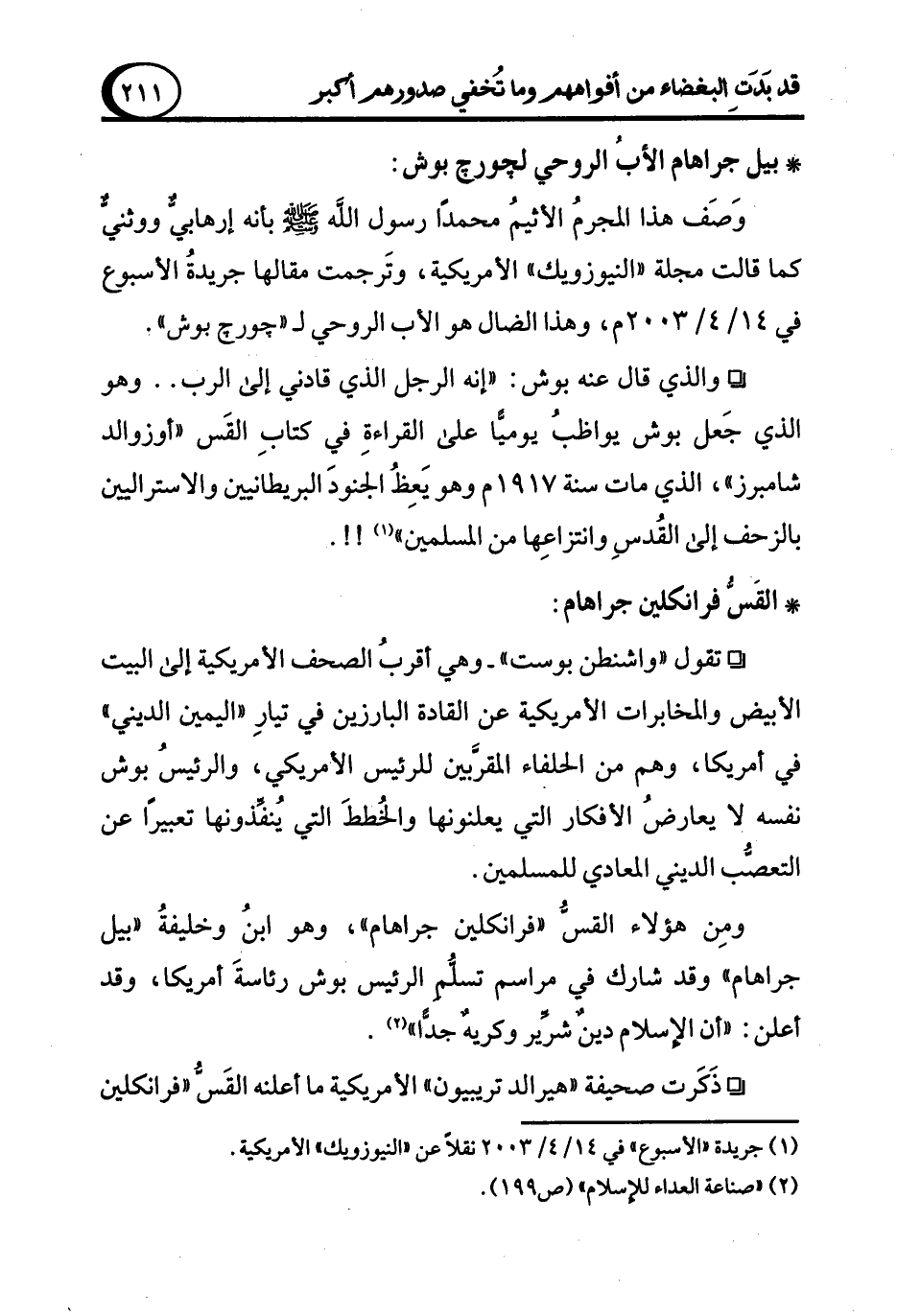 ° تقول "واشنطن بولست" -وهي أقربُ الصحف الأمريكية إلى البيت الأبيض والمخابرات الأمريكية عن القادة البارزين في تيارِ "اليمين الديني" في أمريكا، وهم من الحلفاء المقرَّبين للرئيس الأمريكي، والرئيسُ بوش نفسه لا يعارضُ الأفكار التي يعلنونها والخُططَ التي يُنفِّذونها تعبيرًا عن التعصُّب الديني المعادي للمسلمين.