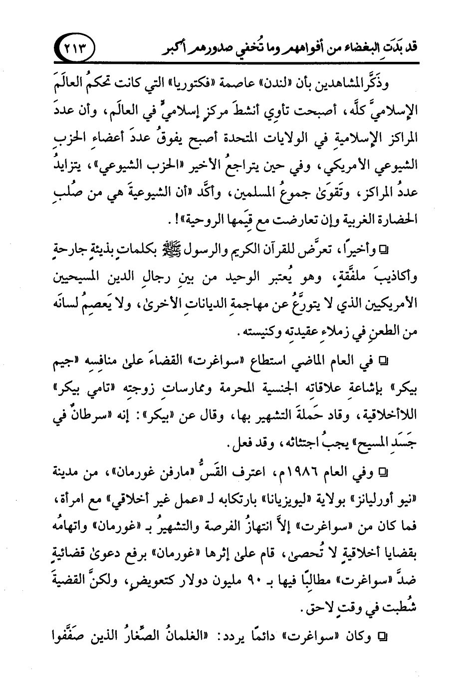 ° وأخيرًا، تعرَّض للقرآن الكريم والرسول - صلى الله عليه وسلم - بكلماتِ بذيئةٍ جارحةٍ وأكاذيبَ ملفَّقةٍ، وهو يُعتبر الوحيد من بينِ رجالِ الدين المسيحيين الأمريكيين الذي لا يتورَّع عن مهاجمةِ الدياناتِ الأخرى، ولا يَعصِمُ لسانَه من الطعنِ في زملاءِ عقيدتِه وكنيسته.