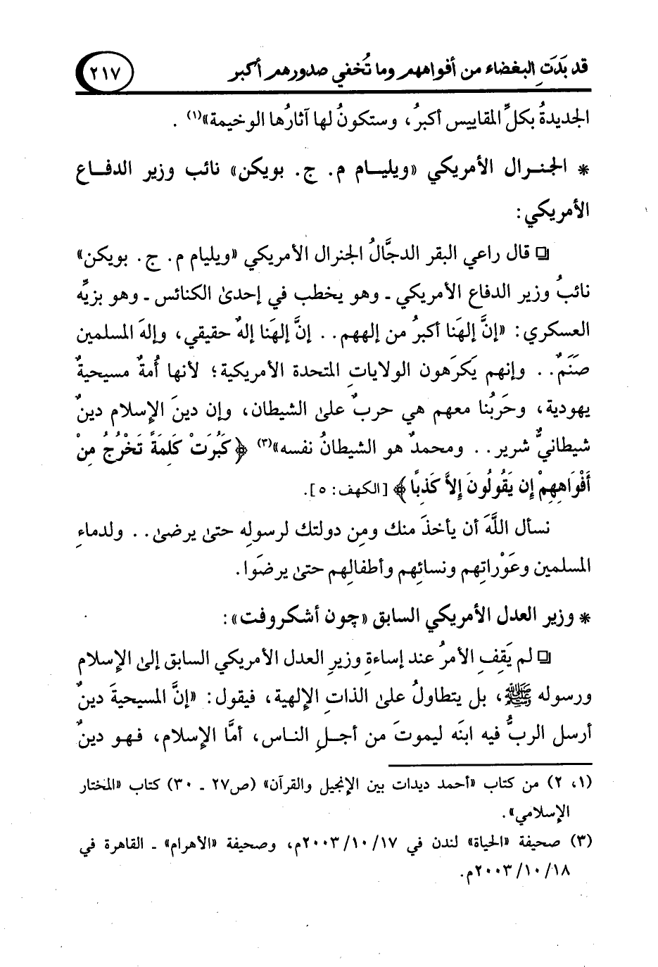 ° قال راعي البقر الدجَّالُ الجنرال الأمريكي "ويليام م. ج. بويكن" نائبُ وزير الدفاع الأمريكي -وهو يخطب في إحدى الكنائس- وهو بزيِّه العسكري: "إنَّ إلهَنا أكبرُ من إلههم .. إنَّ إلهَنا إلهٌ حقيقي، وإلهَ المسلمين صَنَمٌ .. وإنهم يَكرَهون الولايات المتحدة الأمريكية؛ لأنها أُمةٌ مسيحيةٌ يهودية، وحَربُنا معهم هي حربٌ على الشيطان، وإن دينَ الإسلام دينٌ شيطانيٌّ شرير .. ومحمدٌ هو الشيطان نفسه" (¬2) {كَبُرَتْ كَلِمَةً تَخْرُجُ مِنْ أَفْوَاهِهِمْ إِنْ يَقُولُونَ إِلَّا كَذِبًا} [الكهف: 5].