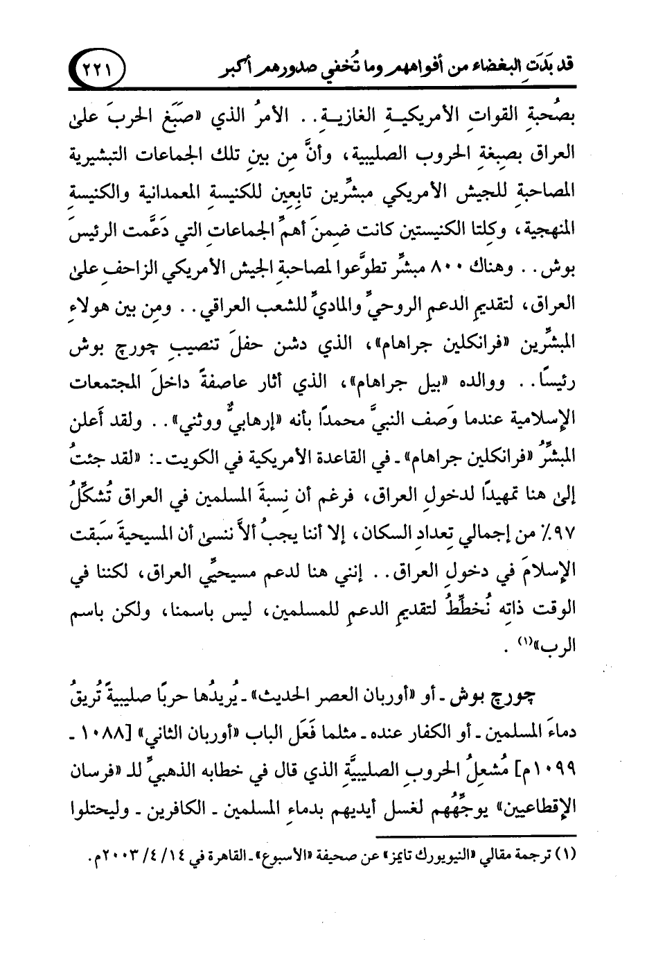 بصُحبةِ القواتِ الأمريكيةِ الغازيةِ .. الأمرُ الذي "صَبَغ الحربَ على العراق بصِبغةِ الحروب الصليبية، وأنَّ مِن بينِ تلك الجماعات التبشيرية المصاحبةِ للجيش الأمريكي مبشِّرين تابِعِين للكنيسةِ المعمدانية والكنيسةِ المنهجية، وكِلتا الكنيستين كانت ضِمنَ أهمِّ الجماعاتِ التي دَعَّمت الرئيسَ بوش .. وهناك 800 مبشِّر تطوَّعوا لمصاحبةِ الجيش الأمريكي الزاحفِ على العراق، لتقديم الدعمِ الروحيِّ والماديِّ للشعب العراقي .. ومِن بين هولاءِ المبشِّرين "فرانكلين جراهام"، الذي دشن حفلَ تنصيبِ جورج بوش رئيسًا .. ووالده "بيل جراهام"، الذي أثار عاصفةً داخلَ المجتمعات الإسلامية عندما وَصف النبيَّ محمدًا بأنه "إرهابيٌّ ووثني" .. ولقد أَعلن المبشِّرُ "فرانكلين جراهام" -في القاعدة الأمريكية في الكويت-: "لقد جئتُ إلى هنا تمهيدًا لدخولِ العراق، فرغم أن نِسبةَ المسلمين في العراق تُشكِّلُ 97% من إجمالي تِعدادِ السكان، إلا أننا يجبُ ألاَّ ننسى أن المسيحيةَ سَبقت الإسلامَ في دخول العراق .. إنني هنا لدعم مسيحيِّ العراق، لكننا في الوقت ذاتِه نُخطِّطُ لتقديمِ الدعمِ للمسلمين، ليس باسمنا، ولكن باسم الرب" (¬1).