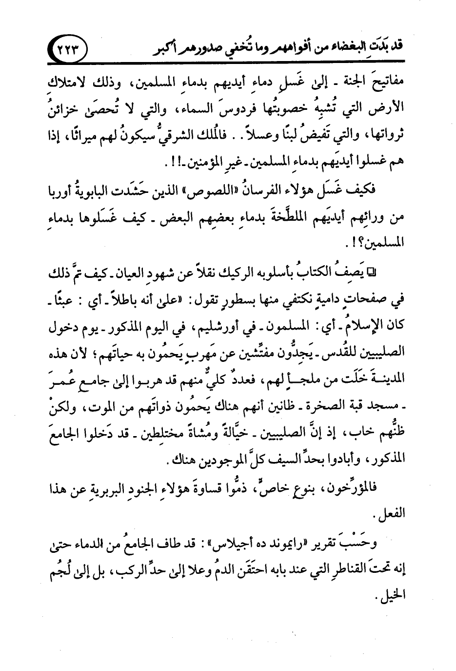 ° يَصِفُ الكتابُ بأسلوبه الركيك نقلاً عن شهودِ العيان -كيف تمَّ ذلك في صفحاتٍ داميةٍ نكتفي منها بسطورٍ تقول: "على أنه باطلاً- أي: عبثًا -كان الإسلامُ- أي: المسلمون -في أورشليم، في اليوم المذكور- يوم دخول الصليبيين للقُدس- يَجِدُّون مفتِّشين عن مَهربٍ يَحمُون به حياتَهم؛ لأن هذه المدينةَ خَلَت من ملجإٍ لهم، فعددٌ كليٌّ منهم قد هربوا إلى جامع عُمرَ -مسجد قبة الصخرة- ظانين أنهم هناك يَحمُون ذواتَهم من الموت، ولكنْ ظنُّهم خاب، إذ إنَّ الصليبيين -خيَّالةً ومُشاةً مختلِطين- قد دَخلوا الجامعَ المذكور، وأبادوا بحدِّ السيف كلَّ الموجودين هناك.
