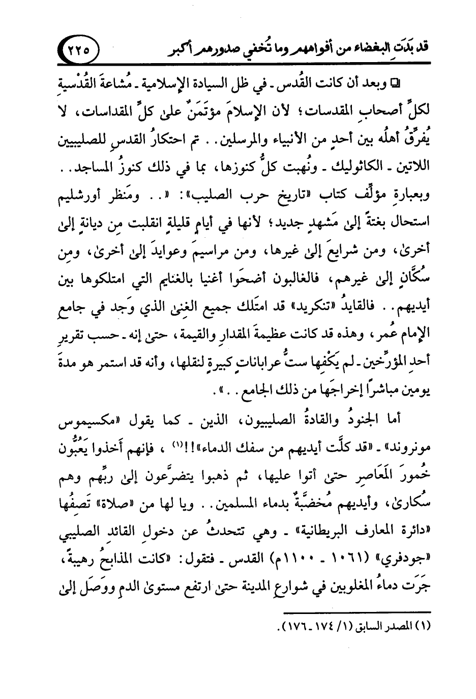 أما الجنودُ والقادةُ الصليبيون، الذين -كما يقول "مكسيموس مونروند"- "قد كلَّت أيديهم من سفك الدماء"!! (¬1)، فإنهم أَخذوا يَعُبُّون خُمورَ المَعَاصِر حتى أتوا عليها، ثم ذهبوا يتضرَّعون إلى ربِّهم وهم سُكارى، وأيديهم مُخضَّبةٌ بدماء المسلمين .. ويا لها من "صلاة" تَصِفُها "دائرة المعارف البريطانية" - وهي تتحدثُ عن دخولِ القائدِ الصليبي "جودفري" (1061 - 1100م) القدس- فتقول: كانت المذابحُ رهيبةً، جَرَت دماءُ المغلوبين في شوارع المدينة حتى ارتفع مستوى الدمِ ووَصَل إلى
