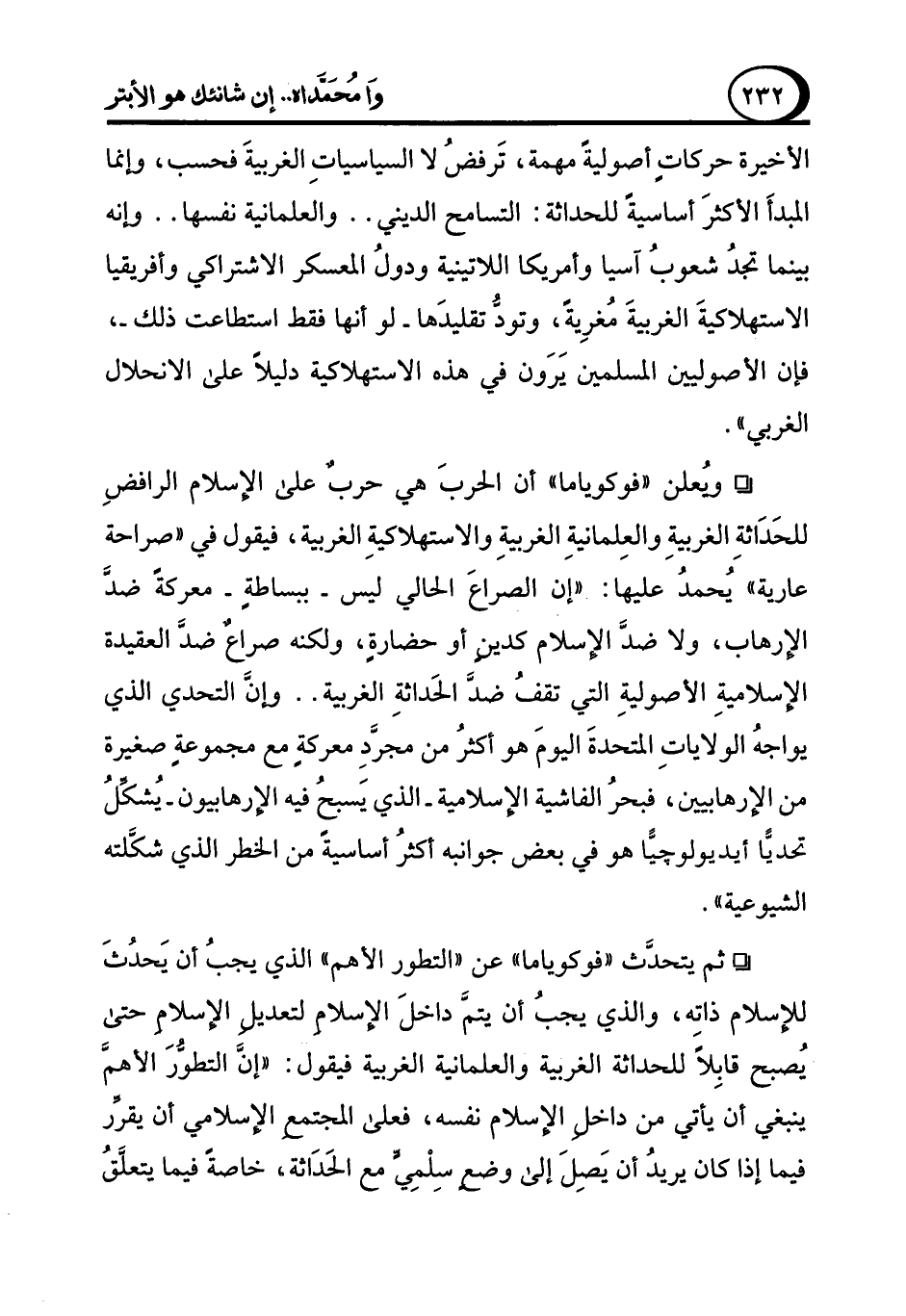 ° وُيعلن "فوكوياما" أن الحربَ هي حربٌ على الإسلام الرافضِ للحَدَاثةِ الغربيةِ والعِلمانيةِ الغربيةِ والاستهلاكيةِ الغربية، فيقول في "صراحة عارية" يُحمدُ عليها: "إن الصراعَ الحالي ليس -ببساطةٍ- معركةً ضدَّ الإرهاب، ولا ضدَّ الإسلام كدين أو حضارةٍ، ولكنه صراعٌ ضدَّ العقيدة الإسلاميةِ الأصوليةِ التي تقفُ ضدَّ الحَداثةِ الغربية .. وإنَّ التحدي الذي يواجهُ الولاياتِ المتحدةَ اليومَ هو أكثرُ من مجرَّد معركةٍ مع مجموعةٍ صغيرة من الإرهابيين، فبحرُ الفاشية الإسلامية -الذي يسبحُ فيه الإرهابيون- يُشكِّلُ تحديًّا أيديولوجيًّا هو في بعض جوانبه أكثرُ أساسيةً من الخطر الذي شكَّلته الشيوعية".