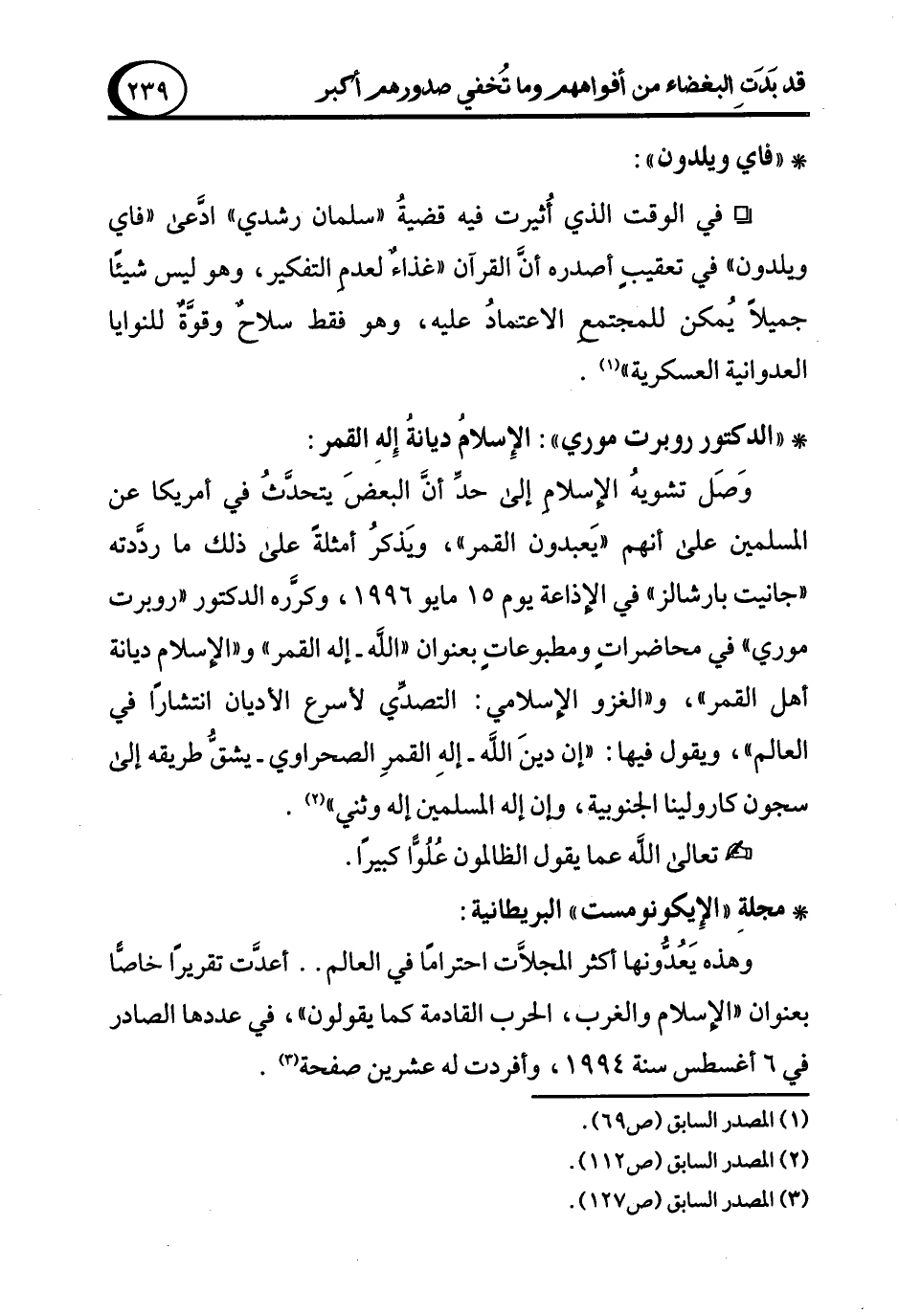 ° في الوقت الذي أُثيرت فيه قضيةُ "سلمان رشدي" ادَّعى "فاي ويلدون" في تعقيبٍ أصدره أن القرآن "غذاءٌ لعدم التفكير، وهو ليس شيئًا جميلاً يُمكن للمجتمع الاعتمادُ عليه، وهو فقط سلاحٌ وقوَّةٌ للنوايا العدوانية العسكرية" (¬1).