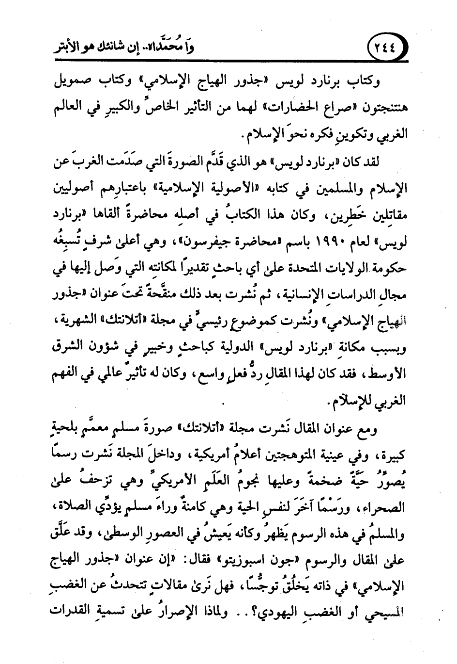 وكتاب برنارد لويس "جذور الهياج الإسلامي" وكتاب صمويل هنتنجتون "صراع الحضارات" لهما من التأثير الخاصِّ والكبيرِ في العالم الغربي وتكوينِ فكره نحوَ الإسلام.