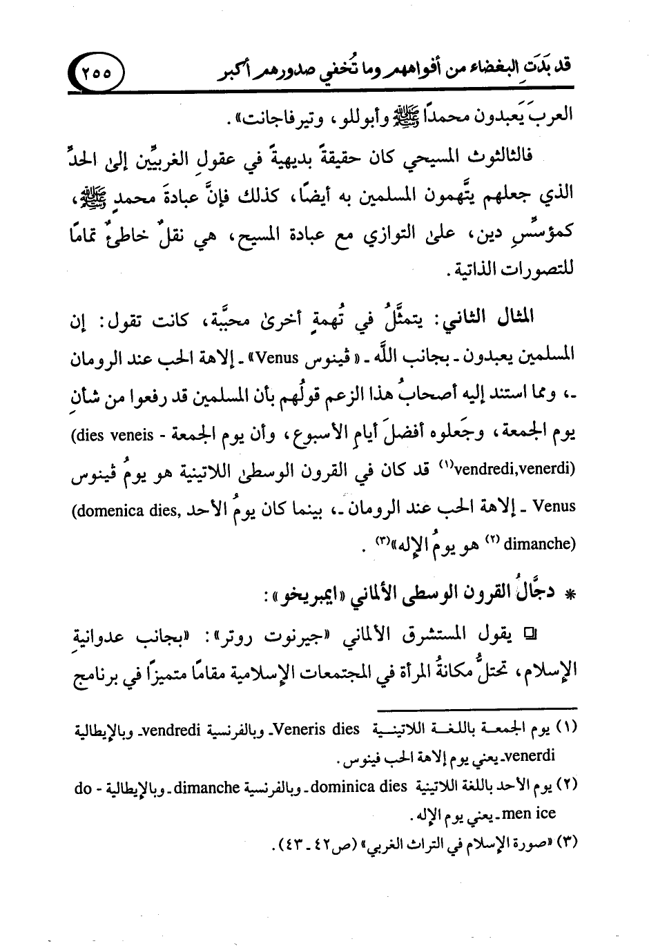 المثال الثاني: يتمثَّلُ في تُهمةٍ أخرى محبَّبة، كانت تقول: إن المسلمين يعبدون -بجانب الله- "فينوس Venus" - إلاهة الحب عند الرومان-، ومما استند إليه أصحابُ هذا الزعم قولُهم بأن المسلمين قد رفعوا من شأنِ يوم الجمعة، وجَعلوه أفضلَ أيامِ الأسبوع، وأن يوم الجمعة - ( Dies veneis - vendredi, venerdi)) (¬1) قد كان في القرون الوسطى اللاتينية هو يومُ فينوس Venus - إلاهة الحب عند الرومان-، بينما كان يومُ الأحد ( domenica dies, dimanche) (¬2) هو يومُ الإله" (¬3).
