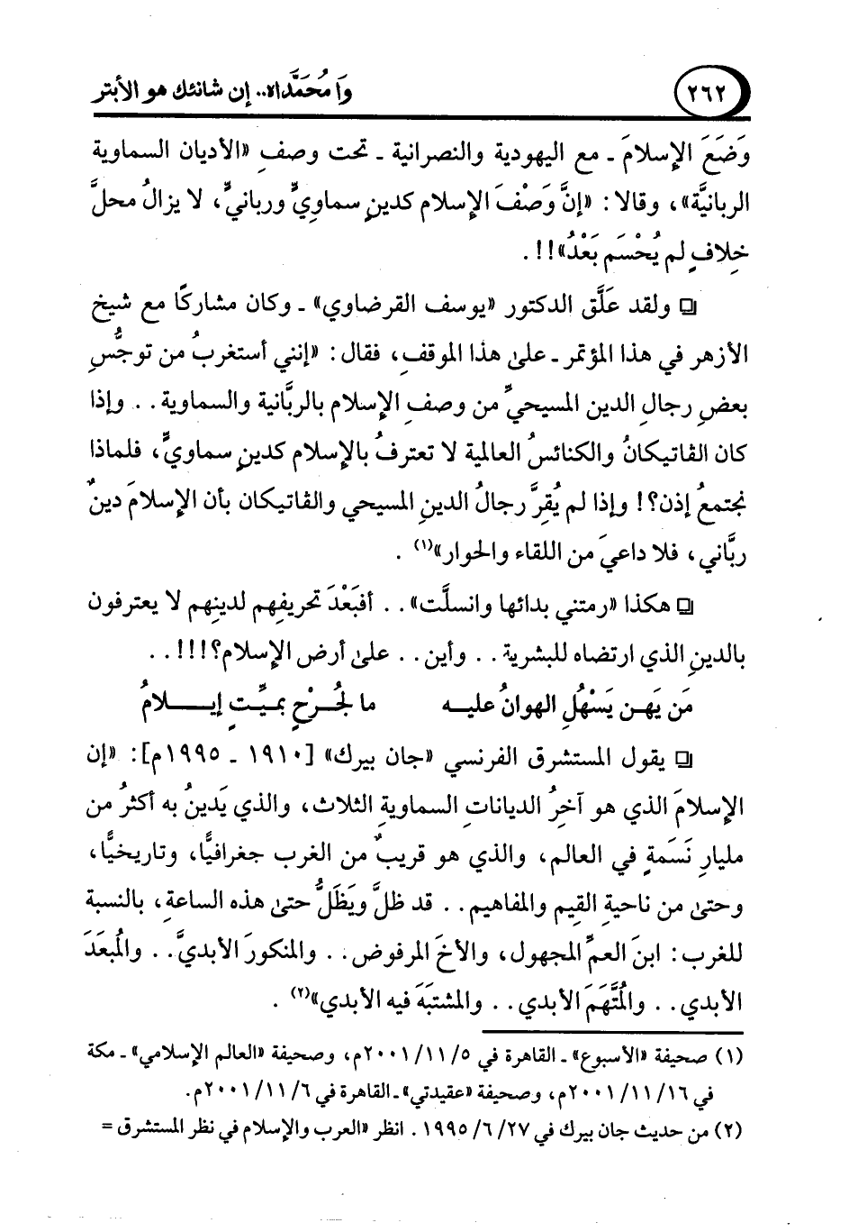 ° يقول المستشرق الفرنسي "جان بيرك" [1910 - 1995م]: "إن الإسلامَ الذي هو آخِرُ الدياناتِ السماويةِ الثلاث، والذي يَدينُ به أكثرُ من مليارِ نَسَمةٍ في العالم، والذي هو قريبٌ من الغرب جغرافيًّا، وتاريخيًّا، وحتى من ناحيةِ القِيم والمفاهيم .. قد ظلَّ ويَظَلُّ حتى هذه الساعةِ، بالنسبة للغرب: ابنَ العمِّ المجهول، والأخَ المرفوض .. والمنكورَ الأبديَّ .. والمُبعَدَ الأبدي .. والمُتَّهَمَ الأبدي .. والمشتبَهَ فيه الأبدي" (¬2).