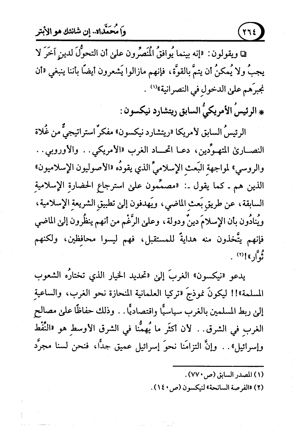 الرئيسُ السابق لأمريكا "ريتشارد نيكسون" مفكرٌ استراتيجيٌّ من غُلاة النصارى المتهوِّدين، دعا اتحاد الغرب "الأمريكي .. والأوروبي .. والروسي" لمواجهةِ البَعثِ الإسلاميِّ الذي يقودُه "الأصوليون الإسلاميون" الذين هم -كما يقول-: "مصمِّمون على استرجاعِ الحضارةِ الإسلاميةِ السابقة، عن طريقِ بَعثِ الماضي، ويَهدفون إلى تطبيقِ الشريعةِ الإسلامية، وينادُون بأن الإسلامَ دينٌ ودولة، وعلى الرَّغْم من أنهم ينظُرون إلى الماضي فإنهم يتَّخذون منه هدايةً للمستقبل، فهم ليسوا محافِظين، ولكنهم ثُوَّار"! (¬2).