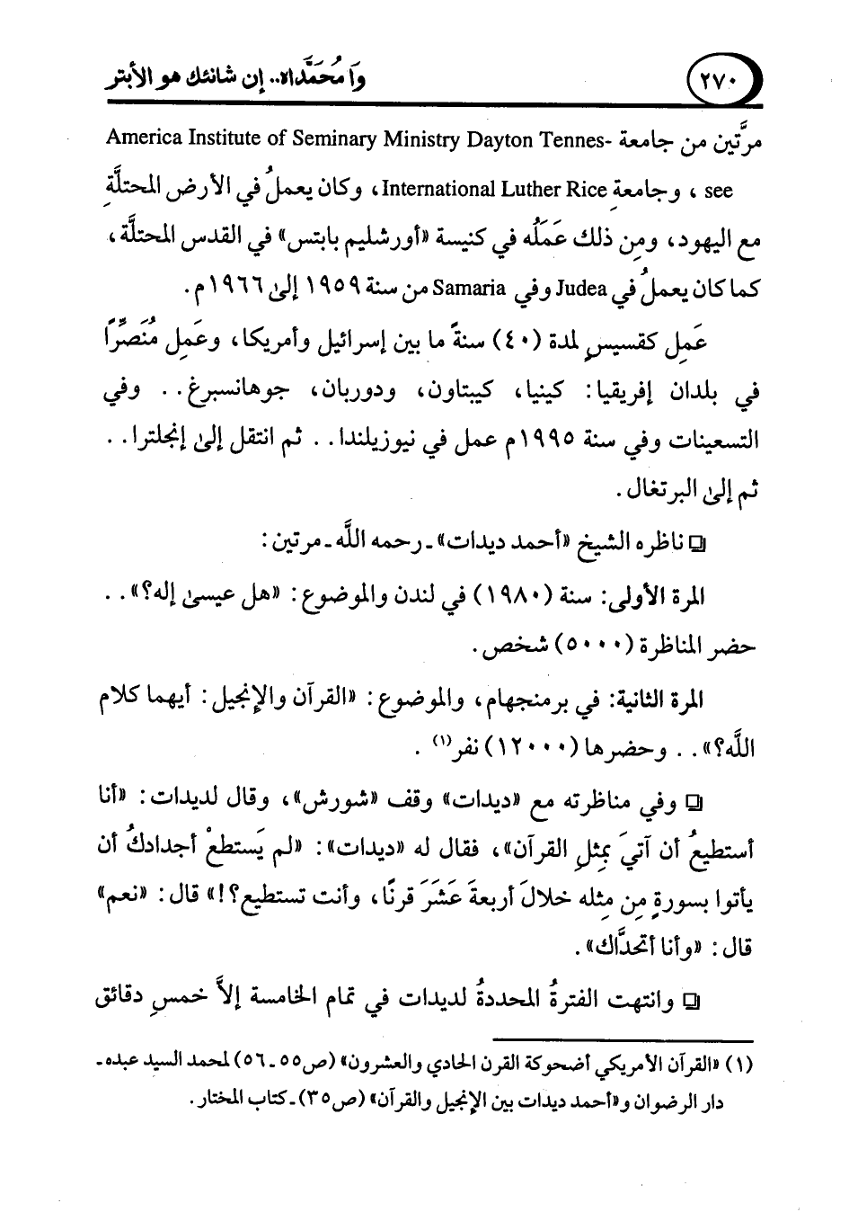 (¬1) "القرآن الأمريكي أضحوكة القرن الحادي والعشرون" (ص 55 - 56) لمحمد السيد عبده - دار الرضوان و"أحمد ديدات بين الإنجيل والقرآن" (ص 35) - كتاب المختار.