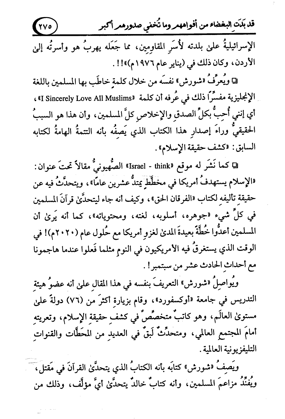 ° ويُعرِّفُ "شورش" نفسَه من خلال كلمةٍ خاطَب بها المسلمين باللغة الإنجليزية مفسِّرًا ذلك في عُرفه أن كلمة " I Sincerely Love All Muslims"، أي إنني أحِبُّ بكلِّ الصدقِ والإخلاصِ كلَّ المسلمين، وأن هذا هو السببُ الحقيقيُّ وراءَ إصدارِ هذا الكتاب الذي يَصِفُه بأنه التتمةُ الهامةُ لكتابه السابق: "كشف حقيقة الإسلام".