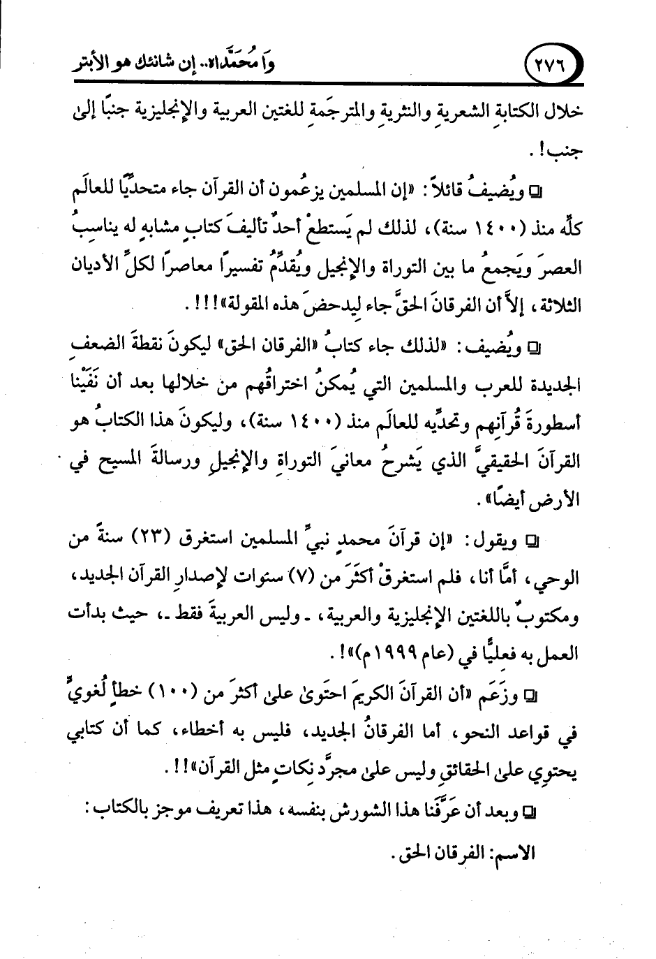 ° ويضيفُ قائلاً: "إن المسلمين يزعُمون أن القرآن جاء متحدِّيًا للعالَم كلِّه منذ (1400 سنة)، لذلك لم يَستطعْ أحدٌ تأليفَ كتابٍ مشابهٍ له يناسِبُ العصرَ وَيجمعُ ما بين التوراة والإنجيل ويقدِّمُ تفسيرًا معاصرًا لكلِّ الأديان الثلاثة، إلاَّ أن الفرقانَ الحقَّ جاء لِيدحضَ هذه المقولة"!!!.