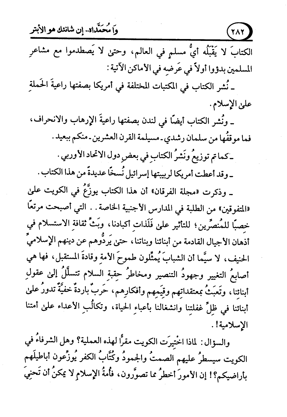 والسؤال: لماذا اخْتِيرَت الكويت مقرًّا لهذه العملية؟ وهل الشرفاءُ في الكويت سيسطرُ عليهم الصمتُ والجمودُ وكُتَّابُ الكفر يُوزِّعون أباطيلَهمِ بأراضيكم؟! إن الأمورَ أخطرُ مما تصوَّرون، فأمةُ الإسلام لا يمكنُ أن تَحنِي