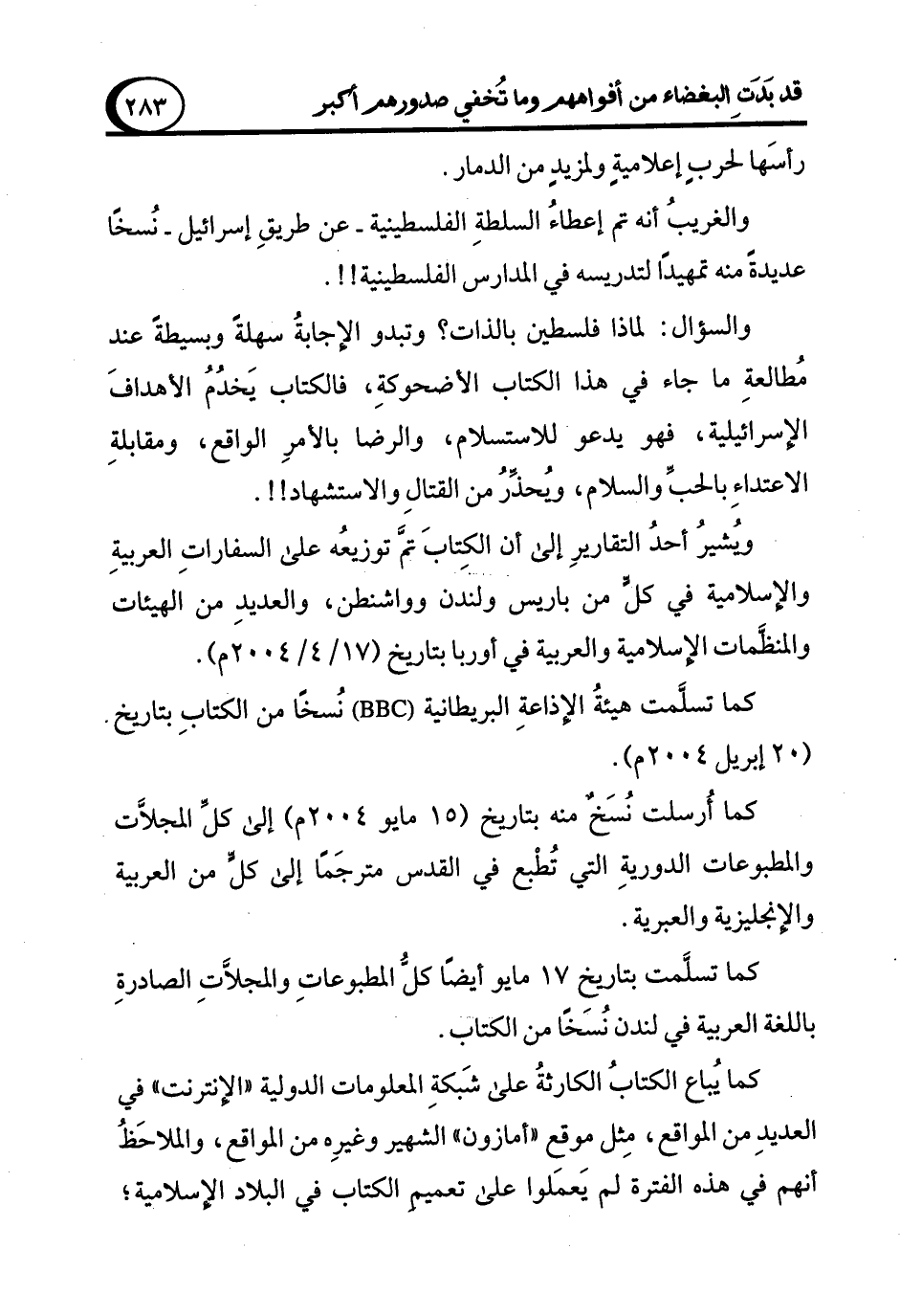 كما تسلَّمت هيئةُ الإذاعةِ البريطانية ( BBC) نُسخًا من الكتابِ بتاريخ. (20 إبريل 2004م).