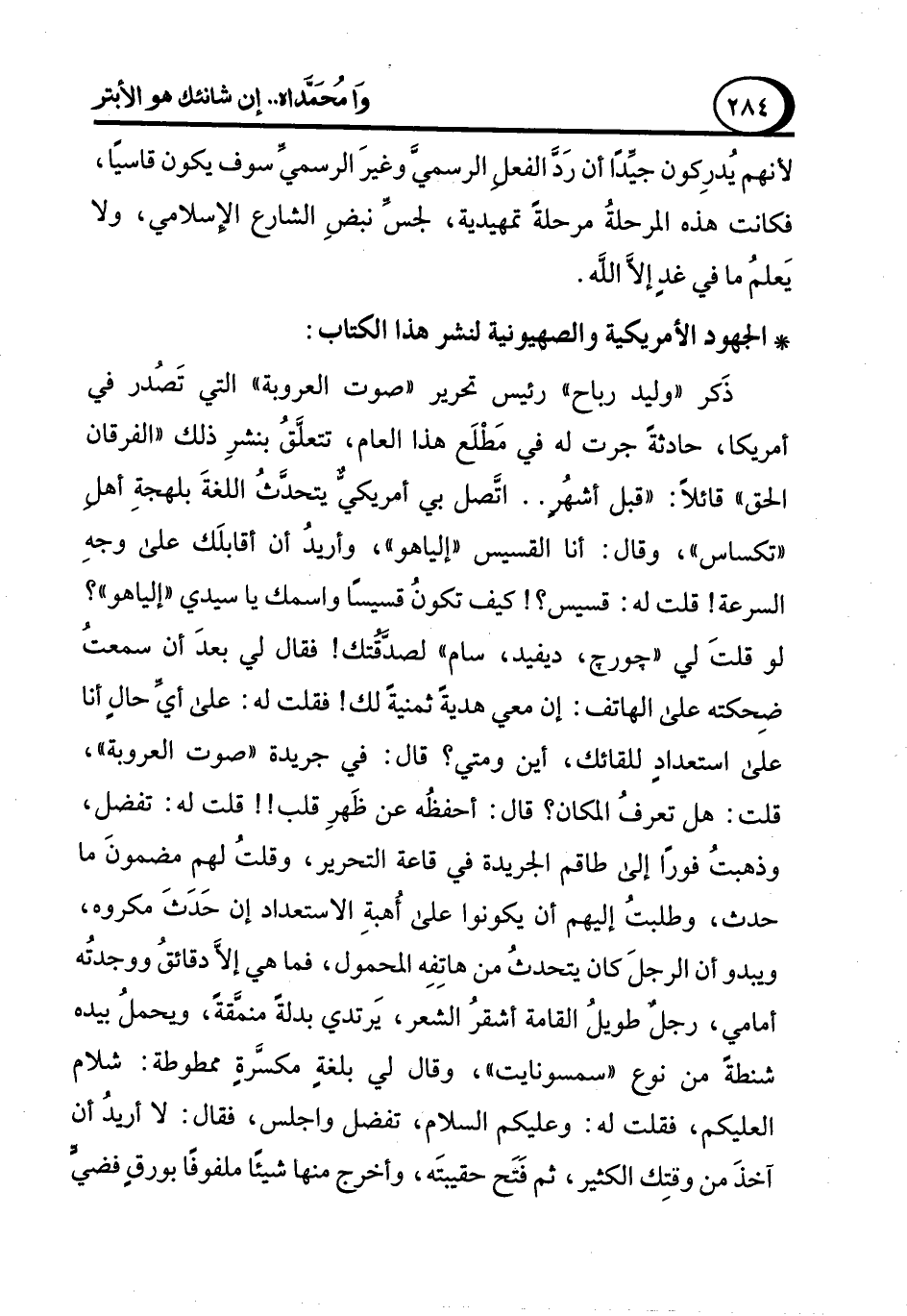 ذَكر "وليد رباح" رئيس تحرير "صوت العروبة" التي تَصدُر في أمريكا، حادثةً جرت له في مَطْلَع هذا العام، تتعلَّقُ بنشرِ ذلك الفرقان الحق" قائلاً: "قبل أشهُرٍ .. اتَّصل بي أمريكيٌّ يتحدَّثُ اللغةَ بلهجةِ أهل "تكساس"، وقال: أنا القسيس "إلياهو"، وأريدُ أن أقابلَك على وجهِ السرعة! قلت له: قسيس؟! كيف تكونُ قسيسًا واسمك يا سيدي "إلياهو"؟ لو قلتَ لي "جورج، ديفيد، سام" لصدَّقتُك! فقال لي بعدَ أن سمعتُ ضِحكته على الهاتف: إن معي هديةً ثمنيةً لك! فقلت له: على أيِّ حالٍ أنا على استعدادٍ للقائك، أين ومتي؟ قال: في جريدة "صوت العروبة"، قلت: هل تعرفُ المكان؟ قال: أحفظُه عن ظَهرِ قلب!! قلت له: تفضل، وذهبتُ فورًا إلى طاقم الجريدة في قاعة التحرير، وقلتُ لهم مضمونَ ما حدث، وطلبتُ إليهم أن يكونوا على أُهبةِ الاستعداد إن حَدَثَ مكروه، ويبدو أن الرجلَ كان يتحدثُ من هاتِفِه المحمول، فما هي إلاَّ دقائقُ ووجدتُه أمامي، رجل طويلُ القامة أشقرُ الشعر، يَرتدي بدلةً منمَّقةً، ويحملُ بيده شنطةً من نوع "سمسونايت"، وقال لي بلغةٍ مكسَّرةٍ ممطوطة: شلام العليكم، فقلت له: وعليكم السلام، تفضل واجلس، فقال: لا أريدُ أن آخذَ من وقتِك الكثير، ثم فَتَح حقيبتَه، وأخرج منها شيئًا ملفوفًا بورقٍ فضيٍّ