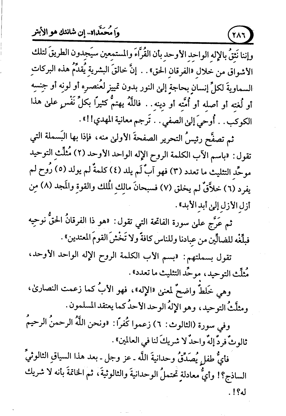 ثم عَرَّج على سورة الفاتحة التي تقول: "هو ذا الفرقانُ الحقُّ نوحِيه فبلِّغْه للضالِّين من عِبادنا وللناس كافةً ولا تَخْشَ القومَ المعتدين".