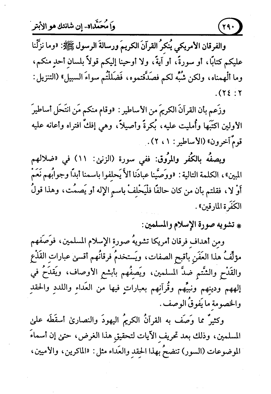 والفرقان الأمريكي يُنكِرُ القرآنَ الكريمَ ورسالةَ الرسول - صلى الله عليه وسلم -: "وما نزَّلنا عليكم كتابًا، أو سورةً، أو آيةً، ولا أوحينا إليكم قولاً بلسانِ أحدٍ منكم، وما ألْهمناه، ولكن شُبِّه لكم فصَدَّقتموه، فَضَللْتُم سواءَ السبيل" (التنزيل: 2: 24).