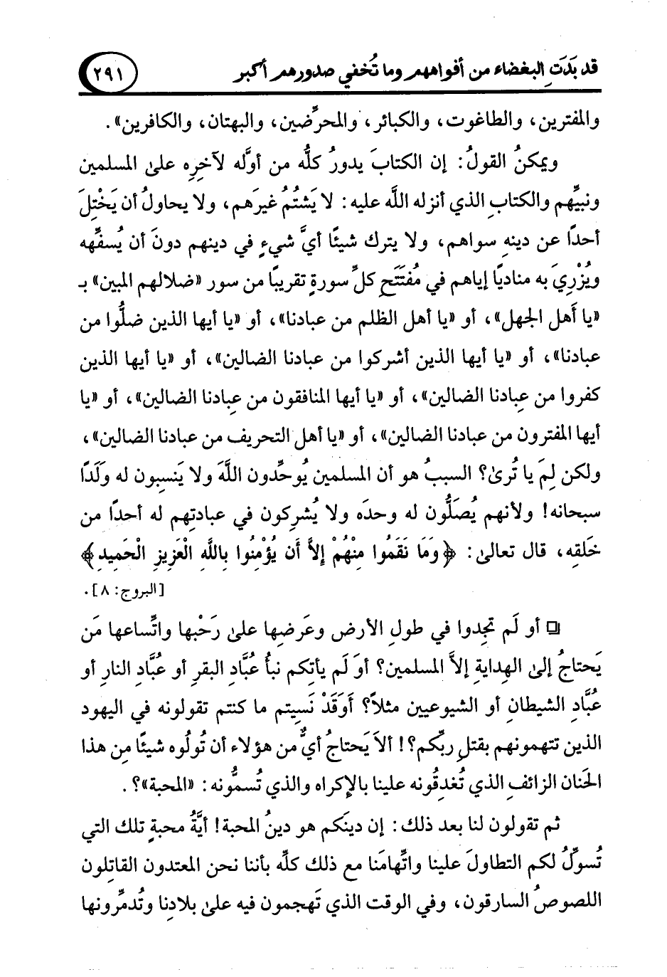 ويمكنُ القولُ: إن الكتابَ يدورُ كلُّه من أوَّله لآخِرِه على المسلمين ونبيِّهم والكتابِ الذي أنزله الله عليه: لا يَشتُمُ غيرَهم، ولا يحاولُ أن يَخْتِلَ أحدًا عن دينهِ سواهم، ولا يترك شيئًا أيَّ شيءٍ في دينهم دونَ أن يُسفهِّه ويُزْرِيَ به مناديًا إياهم في مُفتَتَحِ كلِّ سورةٍ تقريبًا من سور "ضلالهم المبين" بـ "يا أَهل الجهل"، أو "يا أهل الظلم من عبادنا"، أو "يا أيها الذين ضلُّوا من عبادنا"، أو "يا أيها الذين أشركوا من عبادنا الضالين"، أو "يا أيها الذين كفروا من عِبادنا الضالين"، أو "يا أيها المنافقون من عِبادنا الضالين"، أو "يا أيها المفترون من عبادنا الضالين"، أو "يا أهل التحريف من عبادنا الضالين"، ولكن لِمَ يا تُرى؟ السببُ هو أن المسلمين يُوحِّدون اللهَ ولا يَنسِبون له وَلَدًا سبحانه! ولأنهم يُصَلُّون له وحدَه ولا يُشرِكون في عبادتِهم له أحدًا من خَلقِه، قال تعالى: {وَمَا نَقَمُوا مِنْهُمْ إِلَّا أَنْ يُؤْمِنُوا بِاللَّهِ الْعَزِيزِ الْحَمِيدِ} [البروج: 8].