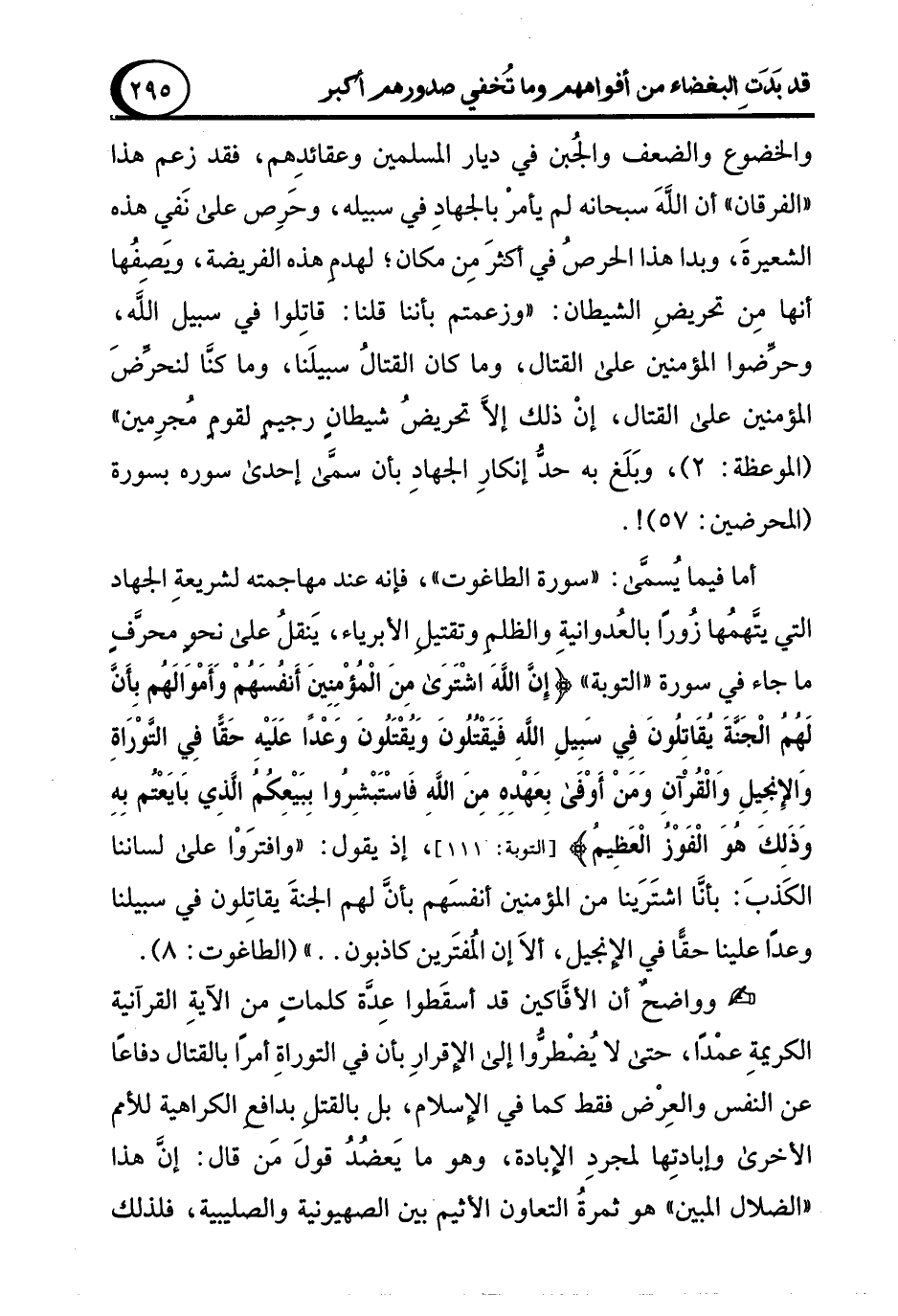 والخضوع والضعف والجُبن في ديار المسلمين وعقائدِهم، فقد زعم هذا "الفرقان" أن اللهَ سبحانه لم يأمرْ بالجهادِ في سبيله، وحَرِص على نَفي هذه الشعيرةَ، وبدا هذا الحرصُ في أكثرَ مِن مكان؛ لهدمِ هذه الفريضة، ويَصِفُها أنها مِن تحريضِ الشيطان: "وزعمتم بأننا قلنا: قاتِلوا في سبيل الله، وحرِّضوا المؤمنين على القتال، وما كان القتالُ سبيلَنا، وما كنَّا لنحرِّضَ المؤمنين على القتال، إنْ ذلك إلاَّ تحريضُ شيطانِ رجيمٍ لقومٍ مُجرِمين" (الموعظة: 2)، وبَلَغ به حدُّ إنكارِ الجهادِ بأن سمَّى إحدى سوره بسورة (المحرضين: 57)!.