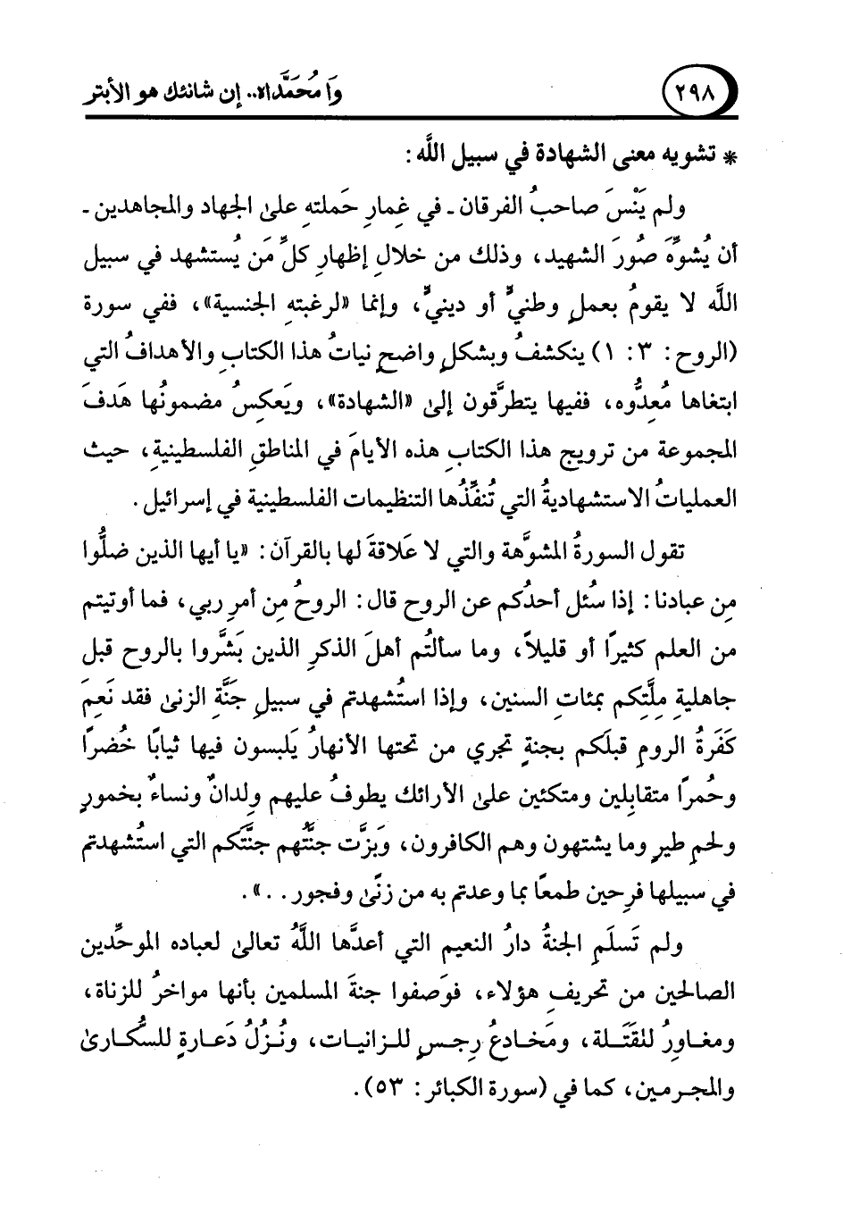 ولم يَنْسَ صاحبُ الفرقان -في غِمارِ حَملتهِ على الجهاد والمجاهدين- أن يُشوِّهَ صورَ الشهيد، وذلك من خلالِ إظهارِ كلِّ مَن يُستشهد في سبيل الله لا يقومُ بعملٍ وطنيٍّ أو دينيٍّ، وإنما "لرغبتهِ الجنسية"، ففي سورة (الروح: 3: 1) ينكشفُ وبشكلٍ واضحٍ نياتُ هذا الكتابِ والأهدافُ التي ابتغاها مُعِدُّوه، ففيها يتطرَّفون إلى "الشهادة"، ويَعكِسُ مضمونُها هَدفَ المجموعة من ترويج هذا الكتابِ هذه الأيامَ في المناطقِ الفلسطينيةٍ، حيث العملياتُ الاستشهاديةُ التي تُنفِّذُها التنظيمات الفلسطينية في إسرائيل.