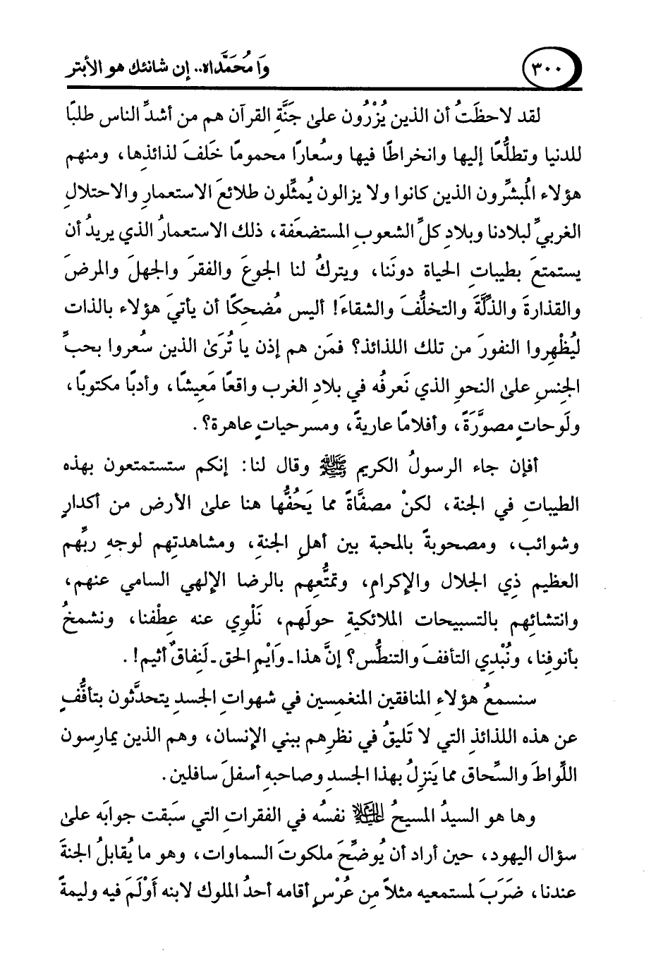 لقد لاحظَتُ أن الذين يُزْرُون على جَنَّةِ القرآن هم من أشدِّ الناس طلبًا للدنيا وتطلُّعًا إليها وانخراطًا فيها وسُعارًا محمومًا خَلفَ لذائذِها، ومنهم هؤلاء المُبشِّرون الذين كانوا ولا يزالون يُمثِّلون طلائعَ الاستعمارِ والاحتلالِ الغربيِّ لبلادنا وبلادِ كلِّ الشعوبِ المستضعَفة، ذلك الاستعمارُ الذي يريدُ أن يستمتعَ بطيباتِ الحياة دونَنا، ويتركُ لنا الجوعَ والفقرَ والجهلَ والمرضَ والقذارةَ والذِّلَّةَ والتخلُّفَ والشقاءَ! أليس مُضحِكًا أن يأتيَ هؤلاء بالذات ليُظْهِروا النفورَ من تلك اللذائذ؟ فمَن هم إذن يا تُرَى الذين سُعروا بحبِّ الجِنسِ على النحوِ الذي نَعرفُه في بلادِ الغرب واقعًا مَعِيشًا، وأدبًا مكتوبًا، ولَوحاتٍ مصوَّرَةً، وأفلامًا عاريةً، ومسرحياتٍ عاهرة؟.