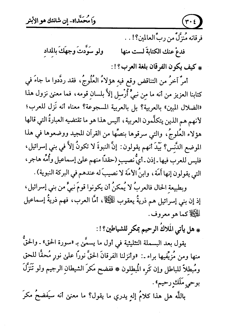 أمرٌ آخرُ من التناقض وقع فيهِ هؤلاءُ العُلُوجُ، فقد ردَّدوا ما جاءَ في كتابنا العزيز من أنه ما مِن نبيٍّ أُرْسِل إلاَّ بلسانِ قومه، فما معنى نزول هذا "الضلال المبين" بالعربية؟ بل بالعربية المسجوعة؟ معناه أنه نَزل للعرب؛ لأنهم هم الذين يتكلَّمون العربية، أليس هذا هو ما تقتضيه العبارةُ التي قالها هؤلاء العُلوجُ، والتي سرقوها بنصِّها من القرآن المجيد ووضعوها في هذا الموضع الدَّنِس؟ بَيْدَ أنهم يقولون: إنَّ النبوةَ لا تكونُ إلاَّ في بني إسرائيل، فليس للعرب فيها -إذن- أيُّ نصيبٍ (حقدًا منهم على إسماعيل وأُمِّه هاجر، التي يقولون إنها أَمَة، وابنُ الأمَة لا نصيبَ له عندهم في البركة النبوية).