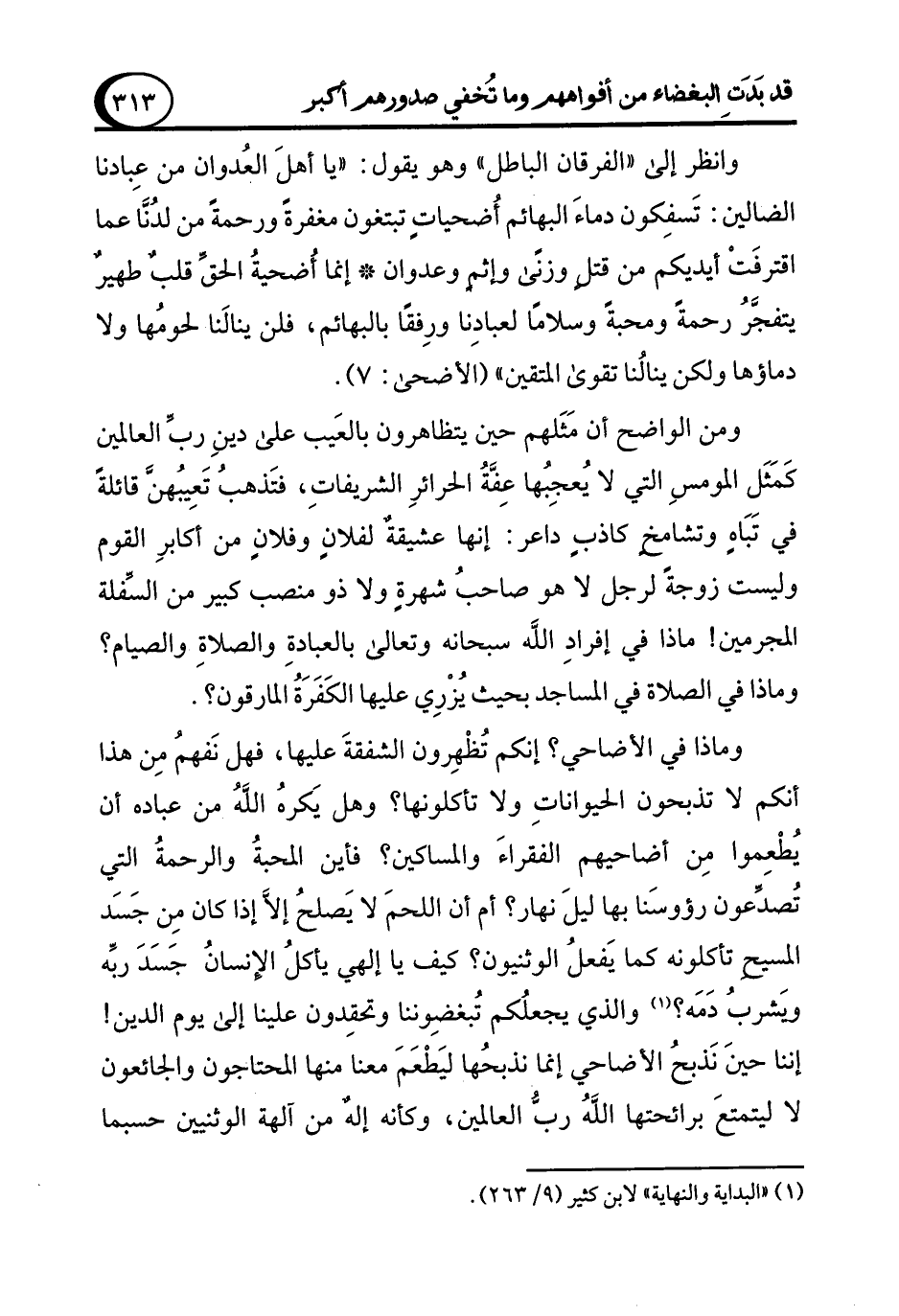وماذا في الأضاحي؟ إنكم تُظْهِرون الشفقةَ عليها، فهل نَفهمُ مِن هذا أنكم لا تذبحون الحيواناتِ ولا تأكلونها؟ وهل يَكرهُ اللهُ من عباده أن يُطْعِموا مِن أضاحيهم الفقراءَ والمساكين؟ فأين المحبةُ والرحمةُ التي تُصدِّعون رؤوسَنا بها ليلَ نهار؟ أم أن اللحمَ لا يَصلحُ إلاَّ إذا كان مِن جَسَد المسيحِ تأكلونه كما يَفعلُ الوثنيون؟ كيف يا إلهي يأكلُ الإنسانُ جَسَدَ ربِّه وَيشربُ دَمَه؟ (¬1) والذي يجعلُكم تُبغضِوننا وتحقِدون علينا إلى يوم الدين! إننا حينَ نَذبحُ الأضاحي إنما نذبحُها ليَطْعَمَ معنا منها المحتاجون والجائعون لا ليتمتعَ برائحتها اللهُ ربُّ العالمين، وكأنه إله من آلهة الوثنيين حسبما