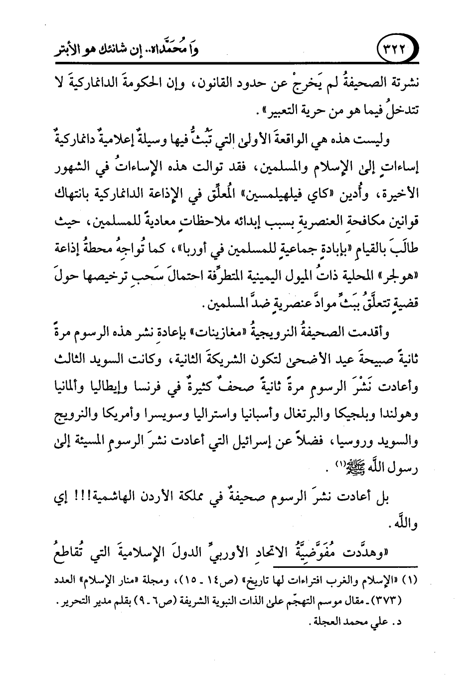 (¬1) "الإسلام والغرب افتراءات لها تاريخ" (ص 14 - 15)، ومجلة "منار الإسلام" العدد (373) - مقال موسم التهجَّم على الذات النبوية الشريفة (ص 6 - 9) بقلم مدير التحرير. د. علي محمد العجلة.