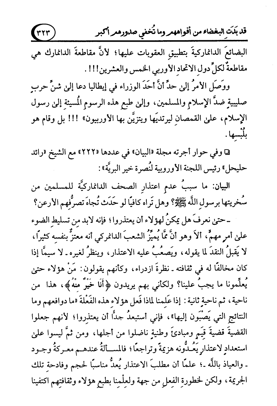 ° "وفي حوار أجرته مجلة "البيان" في عددها "222" مع الشيخ "رائد حليحل" رئيس اللجنة الأوروبية لنُصرة خير البريَّة":