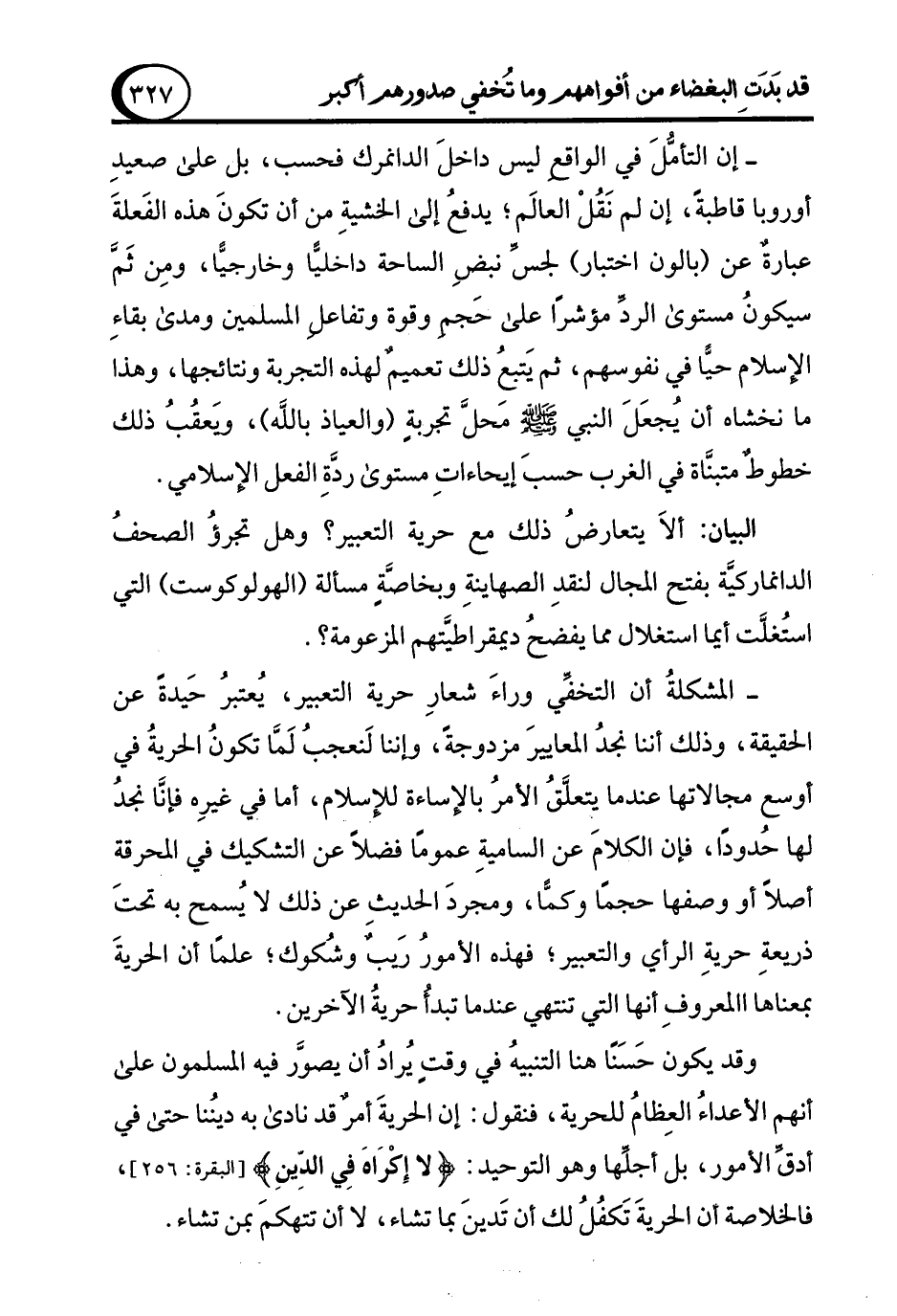 - المشكلةُ أن التخفِّي وراءَ شعارِ حرية التعبير، يُعتبرُ حَيدةً عن الحقيقة، وذلك أننا نجدُ المعاييرَ مزدوجةً، وإننا لَنعجبُ لَمَّا تكونُ الحريةُ في أوسع مجالاتها عندما يتعلَّقُ الأمرُ بالإساءة للاسلام، أما في غيرِه فإنَّا نجدُ لها حُدودًا، فإن الكلامَ عن الساميةِ عمومًا فضلاً عن التشكيك في المحرقة أصلاً أو وصفها حجمًا وكمًّا، ومجردَ الحديث عن ذلك لا يُسمح به تحتَ ذريعةِ حريةِ الرأي والتعبير؛ فهذه الأمورُ رَيبٌ وشُكوك؛ علمًا أن الحريةَ بمعناها المعروفِ أنها التي تنتهي عندما تبدأُ حريةُ الآخرين.