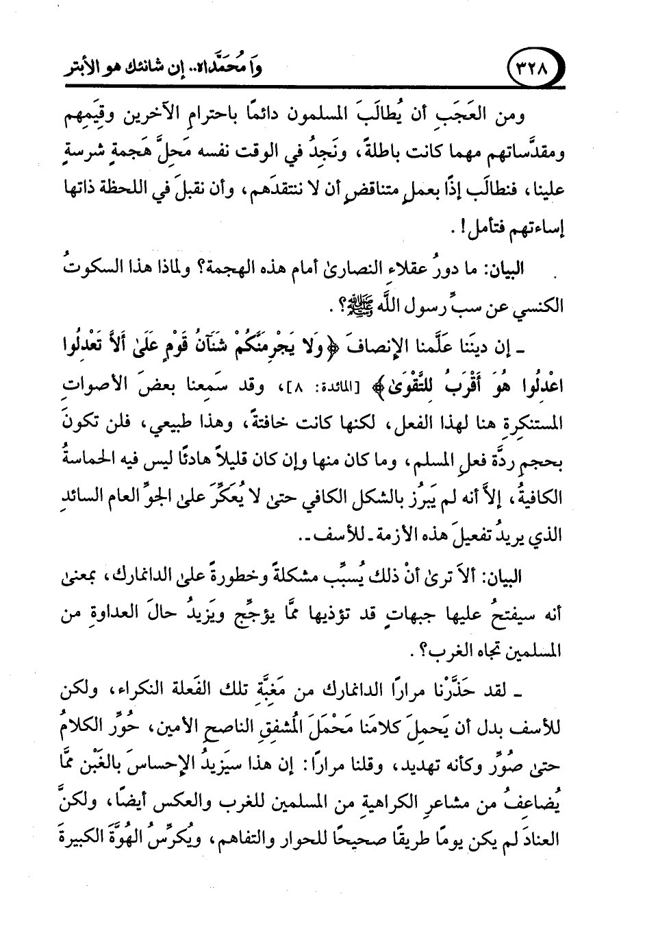 ومن العَجَبِ أن يُطالَبَ المسلمون دائمًا باحترام الآخرين وقِيَمِهم ومقدَّساتهم مهما كانت باطلةً، ونَجِدُ في الوقت نفسه مَحِلَّ هَجمةٍ شرسةٍ علينا، فنطالَب إذًا بعملٍ متناقضٍ أن لا ننتقدَهم، وأن نقبلَ في اللحظة ذاتها إساءتهم فتأمل!.