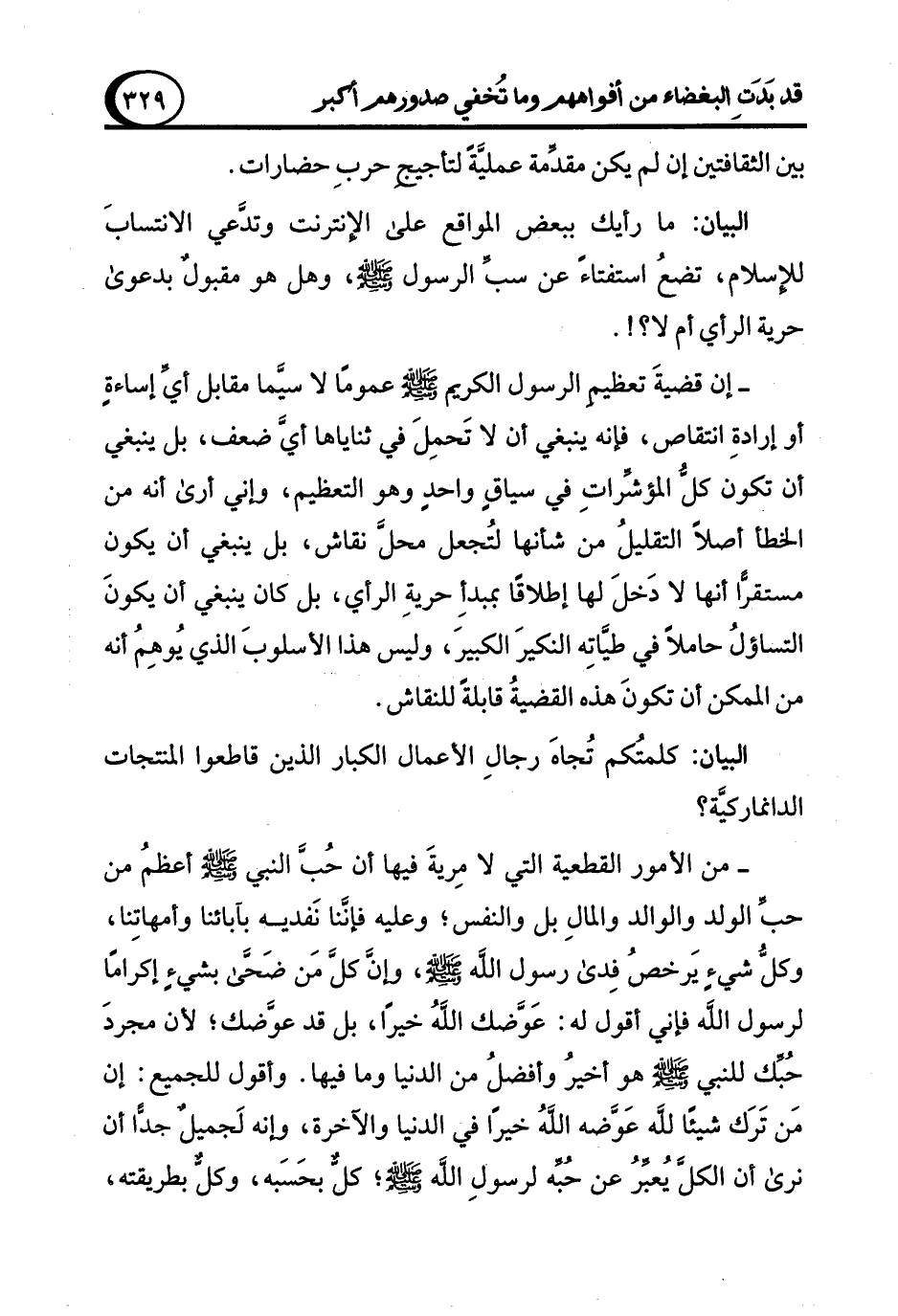 - من الأمور القطعية التي لا مِريةَ فيها أن حُبَّ النبي - صلى الله عليه وسلم - أعظمُ من حبِّ الولد والوالد والمالِ بل والنفس؛ وعليه فإنَّنا نَفديه بآبائنا وأمهاتِنا، وكلُّ شيءٍ يَرخصُ فِدى رسول الله - صلى الله عليه وسلم -، وإنَّ كلَّ مَن ضَحَّى بشيءٍ إكرامًا لرسول الله فإني أقول له: عَوَّضك اللهُ خيرًا، بل قد عوَّضك؛ لأن مجردَ حُبِّك للنبي - صلى الله عليه وسلم - هو أخيرُ وأفضلُ من الدنيا وما فيها. وأقول للجميع: إن مَن تَرَك شيئًا لله عَوَّضه اللهُ خيرًا في الدنيا والآخرة، وإنه لَجميلٌ جدًّا أن نرى أن الكل يُعبِّرُ عن حُبِّه لرسوْلِ الله - صلى الله عليه وسلم -؛ كلٌّ بحَسَبه، وكلٌّ بطريقته ,
