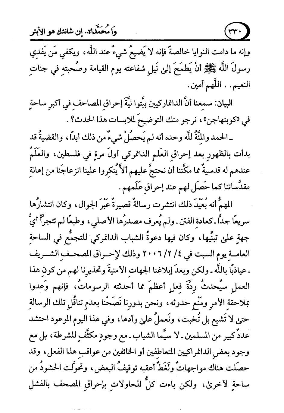 البيان: سمِعنا أنَّ الدانماركيين بيَّتوا نيَّةَ إحراقِ المصاحفِ في أكبرِ ساحةٍ في "كوبنهاجن"، نرجو منك التوضيحَ لملابسات هذا الحدث؟.