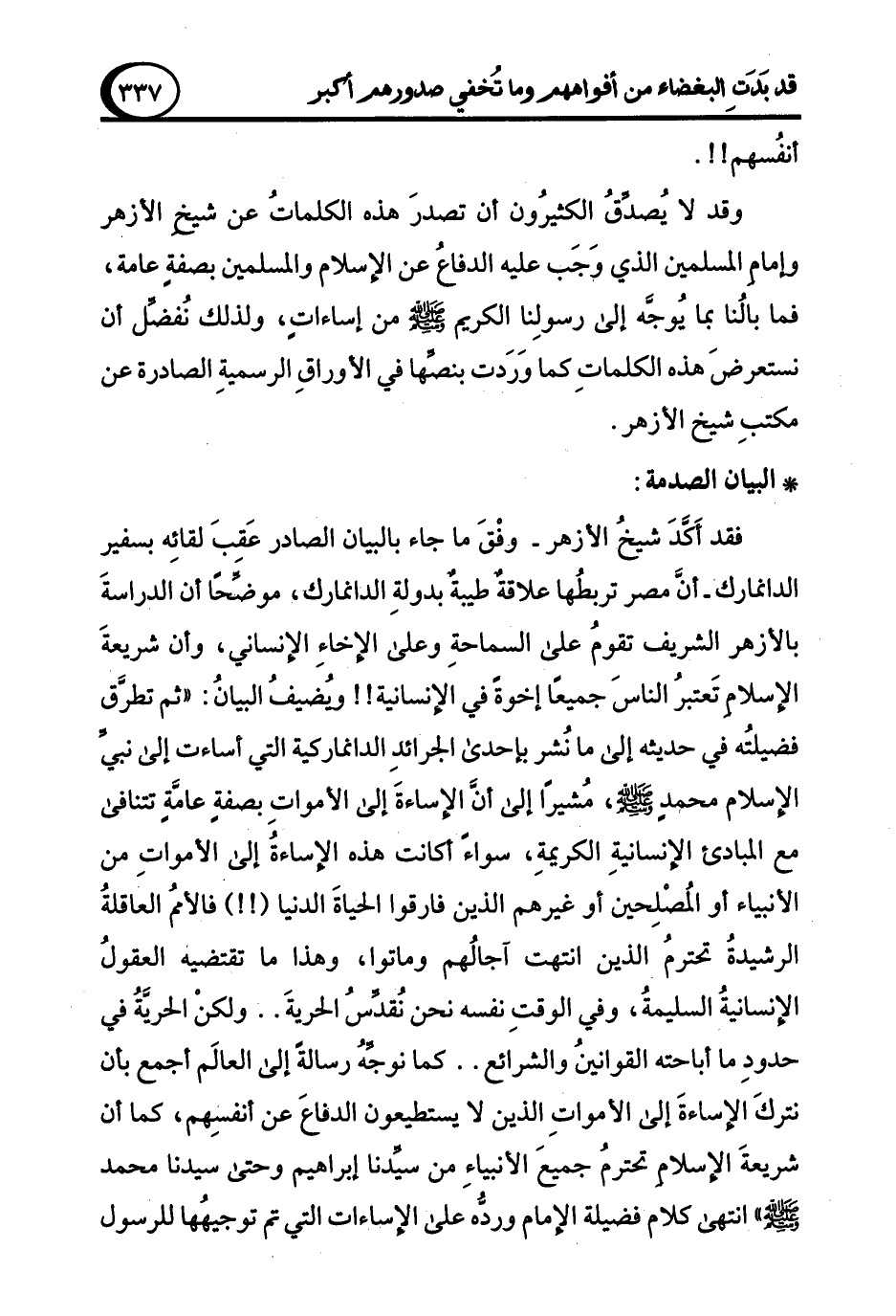 فقد أَكَدَ شيخُ الأزهر -وفْقَ ما جاء بالبيان الصادر عَقبَ لقائِه بسفير الدانمارك- أنَّ مصر تربطُها علاقةٌ طيبةٌ بدولةِ الدانمارك، موضِّحًا أن الدراسةَ بالأزهر الشريف تقومُ على السماحةِ وعلى الإخاءِ الإنساني، وأن شريعةَ الإسلامِ تَعتبرُ الناسَ جميعًا إخوةً في الإنسانية!! ويضيفُ البيانُ: "ثم تطرَّق فضيلتُه في حديثه إلى ما نُشر بإحدى الجرائدِ الدانماركية التي أساءت إلى نبيِّ الإسلام محمدِ - صلى الله عليه وسلم -، مُشيرًا إلى أنَّ الإساءةَ إلى الأمواتِ بصفةٍ عامَّةٍ تتنافى مع المبادئ الإنسانيةِ الكريمةِ، سواءً أكانت هذه الإساءةُ إلى الأمواتِ من الأنبياء أو المُصْلِحين أو غيرهم الذين فارقوا الحياةَ الدنيا (!!) فالأممُ العاقلةُ الرشيدةُ تحترمُ الذين انتهت آجالُهم وماتوا، وهذا ما تقتضيه العقولُ الإنسانيةُ السليمةُ، وفي الوقتِ نفسه نحن نُقدسُ الحريةَ .. ولكنْ الحريَّةُ في حدودِ ما أباحته القوانينُ والشرائع .. كما نوجِّهُ رسالةً إلى العالَم أجمع بأن نتركَ الإساءةَ إلى الأمواتِ الذين لا يستطيعون الدفاعَ عن أنفسِهم، كما أن شريعةَ الإسلامِ تحترمُ جميعَ الأنبياءِ من سيدنا إبراهيم وحتى سيدنا محمد - صلى الله عليه وسلم - انتهى كلام فضيلة الإِمام وردُّه على الإساءات التي تم توجيهُها للرسول