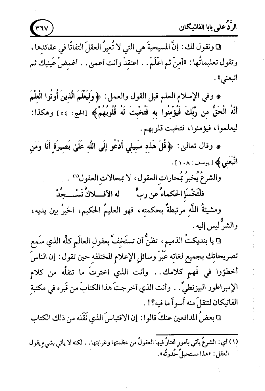 ° يا بنديكتُ الذميم، تظن أن تستَخِفَّ بعقولِ العالَم كلِّه الذي سَمعِ تصريحاتِك بجميع لغاتِه عَبْرَ وسائل الإعلامِ المختلفة حين تقول: إن الناس أخطؤوا في فَهم كلامك .. وأنت الذي اخترتَ ما تنقلُه من كلامِ الإمبراطور البيزنطيِّ .. وأنت الذي أخرجتَ هذا الكتابَ من قَبره في مكتبةِ الفاتيكان لتنقلَ منه أَسوأَ ما فيه؟!.